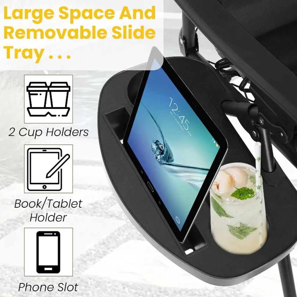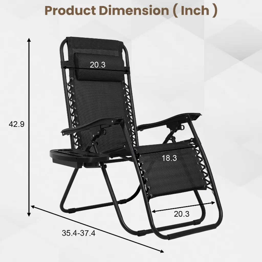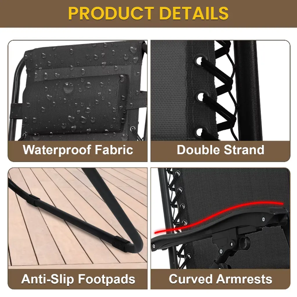 BestMassage High-Quality Zero Gravity Recliner features a sturdy frame that supports up to 275 lbs, ensuring long-lasting durability. The breathable textilene fabric keeps you cool in summer, while cushions provide warmth in winter for year-round comfort. This patio lawn chair is designed for ultimate relaxation, it offers multiple reclining positions and an adjustable headrest, with a built-in cup holder tray for drinks and accessories. The chair’s foldable, lightweight design makes it easy to store and transport, perfect for use by the pool, in the garden, or on the patio. The lockable reclining system allows for smooth, effortless adjustments up to a 160-degree angle. Fully assembled and backed by a reliable warranty, this chair promises a hassle-free lounging experience.
