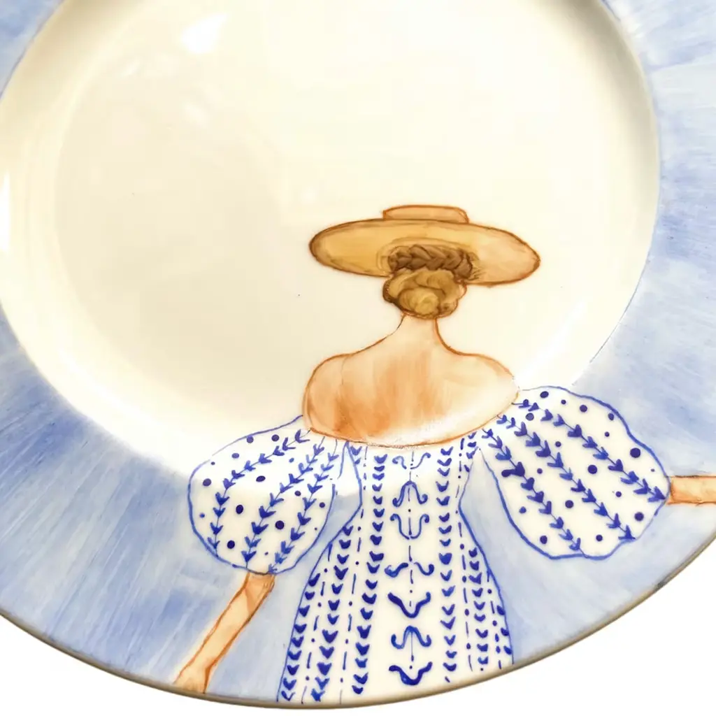 This delicate plate features a serene blue rim and the graceful hand-painted figure of a woman dressed in a flowing gown, evoking the charm of Ischia’s fashionable tourists. Rendered in premium Italian porcelain, this piece is as practical as it is beautiful. Designed for everyday elegance, it can be washed in the dishwasher with ease, maintaining its refined colors and fine craftsmanship throughout the years.