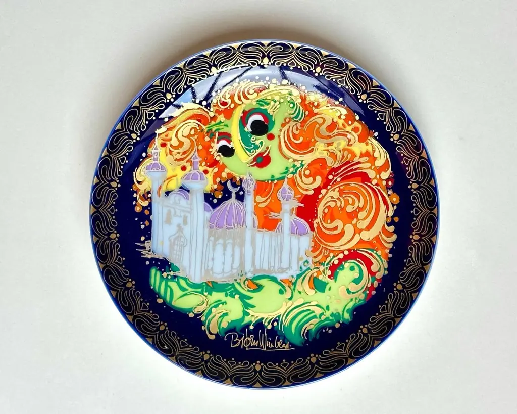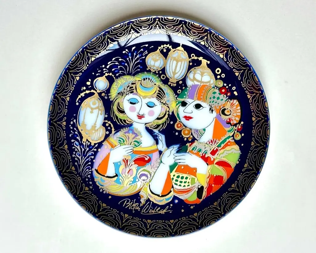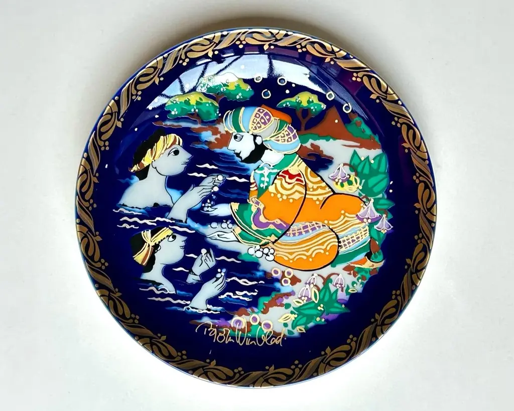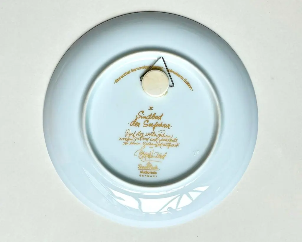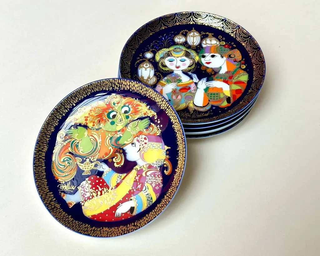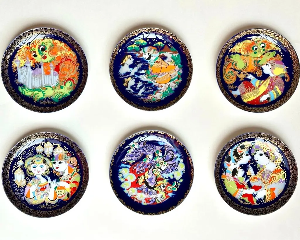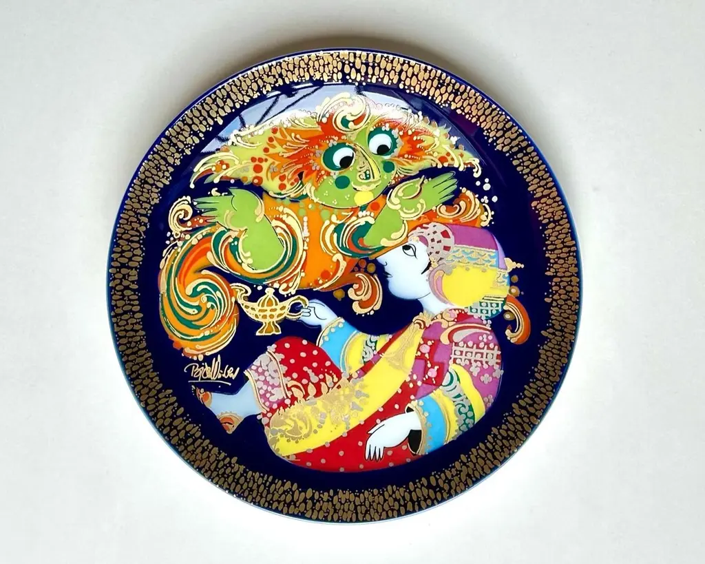 Beautiful decorative plates designed by renowned Danish artist Bjorn Wiinblad for Rosenthal.Germany. 1970s.Porcelain plates from the end of the 20th century based on the fairy tales «The Thousand and One Nights». (Nights of Schaherezade).Diameter: 20 cm.Each plate is made in bright colors on a rich cobalt blue. The gilded ornament enhances the effect of the illustrated scenes.On the reverse side there is a metal hanger with which the plate can be hung on the wall.The plates are excellent for both collection and home decor.Wiinblad’s work can be found in museums around the world, including the Victoria and Albert Museum in London, the Museum of Modern Art in New York and the Stockholm National Museum.1. A lamp genie builds a castle for Aladdin.2. And they lived happily and gratefully!3. Aladdin Meets The Wizard.4. Sindbad and the Pearl Fishers.5. Aladin Marries The Sultan’s Beautiful Daughter.6. Sindbad the sailor.In excellent condition. The price per set of 2 plates!