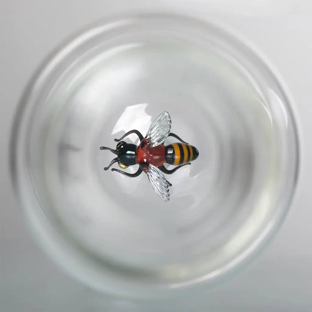 A sleek glass bottle, elegant in its iconic transparency. Within it, a small bee, portrayed in all its delicate essence, is the true protagonist of this work. The only note of color, represented in the smallest detail, from eyes to stinger.