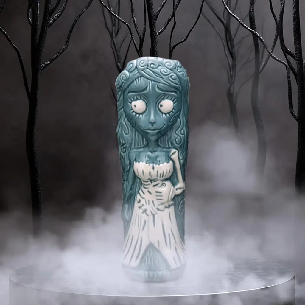 Have a Tiki kind of day! This unique mug incorporates stylization elements seen in traditional Tiki culture, making this no ordinary drinkware. The Corpse Bride Emily 18 oz. Geeki Tikis Mug features a beautifully raised relief and measures approximately 8 1/2-inches tall x 2 3/4-inches wide x 3-inches deep, holding approximately 18 ounces. Pair this 'Corpse Bride' beside her with the BEE27095 Corpse Bride Victor with Scraps 18 oz. Geeki Tikis Mug, (sold separately). Full color, open box packaging. Hand wash only. Not dishwasher safe.