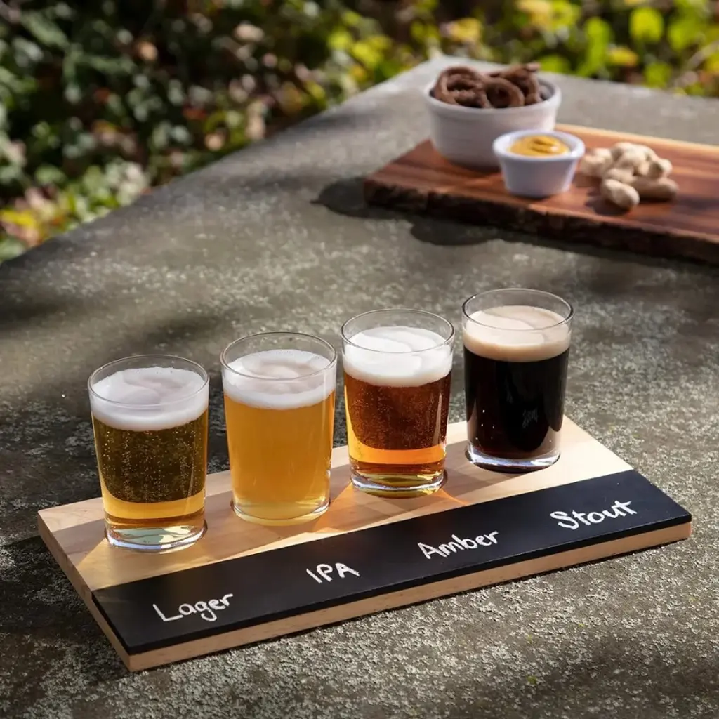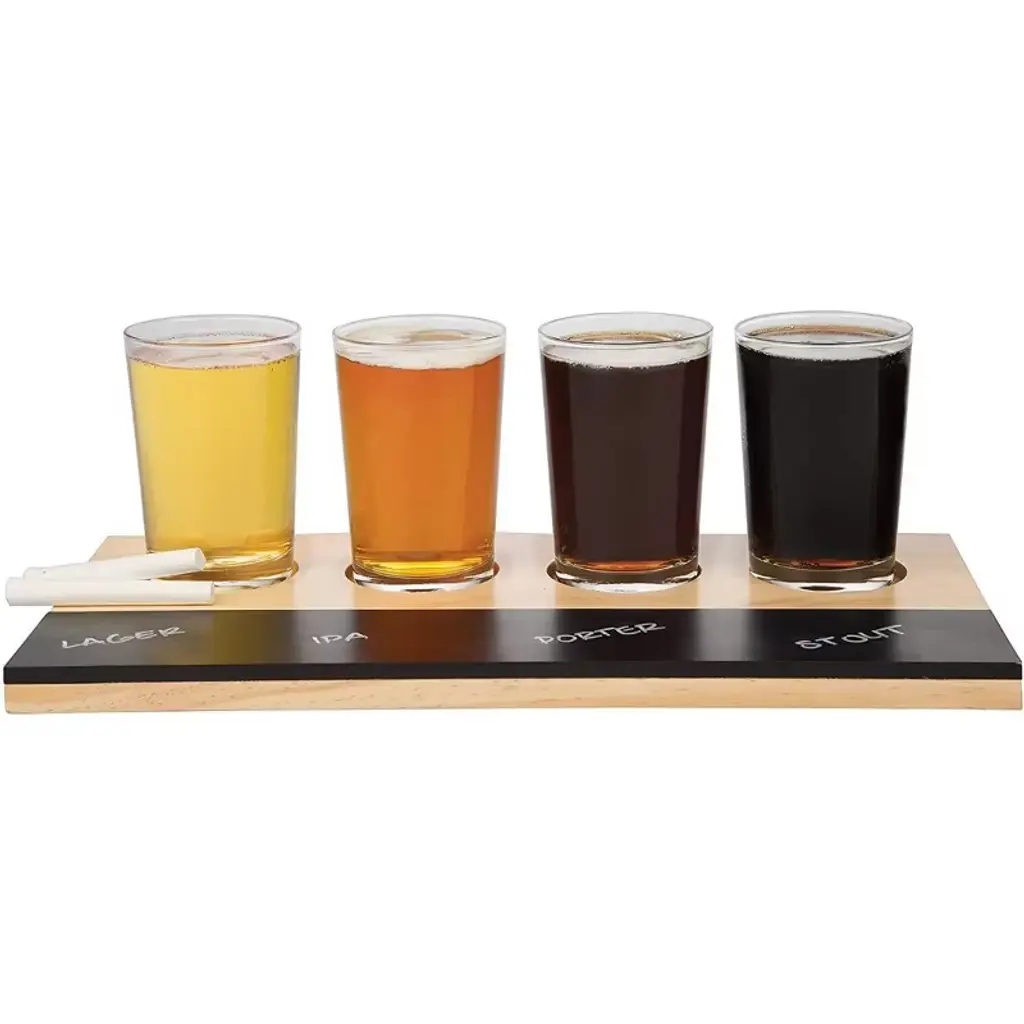 Beer Tasting Flight Sampler Board - Includes Four 6Oz Pilsner Craft Brew Glasses & Wooden Paddle W Chalkboard - Great For Game Night & Taste Testing