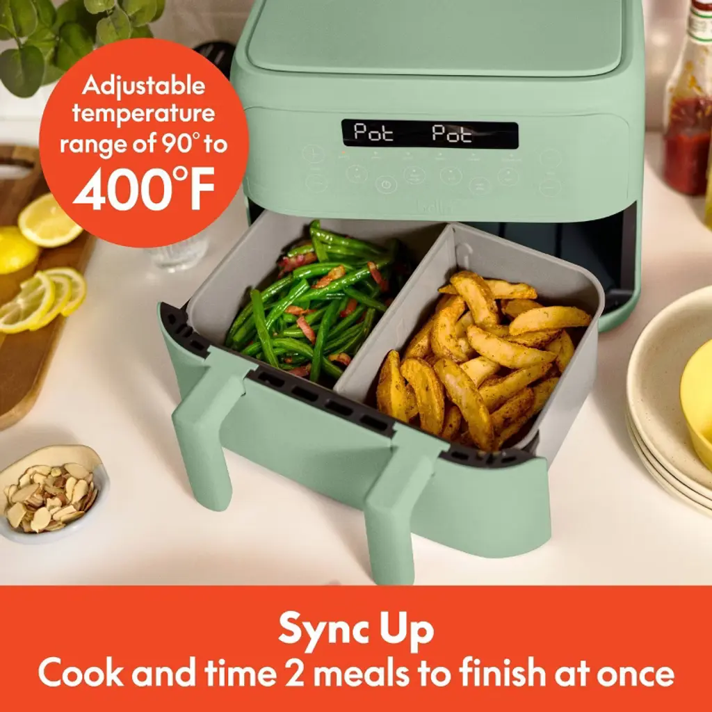 The ultimate mealtime flex, the basket of the bella 4qt TriZone® Air Fryer comes with a removable divider so you can cook 2 meals or 1 large meal all at once. The basket has our EverGood™ Ceramic Nonstick Coating that’s made without PFAS, PFOA, PTFE, lead and cadmium for easy cleanup. Use the super smart Sync Button so whatever you make finishes at the same time. Basket with removable divider holds 3lbs of food like big batches of fries, chicken parmesan, salmon filets and more. Removable divider lets you cook two meals or one big meal—all at once Basket holds 3lbs of food like batches of fries, chicken parmesan, salmon filets and more Intuitive digital controls and 6 presets– air fry, bake, roast, broil, reheat, dehydrate– for quick and tasty meals EverGood™ Ceramic Nonstick Coating is made without PFAS, PFOA, PTFE, lead and cadmium Sync Button allows different foods to finish simultaneously Temperature range of 90º to 400ºF With 1200 watts of power and circular heat technology, this air fryer means crispy food, super fast No more tangled mess–cord neatly tucks away Cool-touch handles and durable construction add confidence and comfort when handling Modern details like rounded corners, soft matte finish and subtle fluting