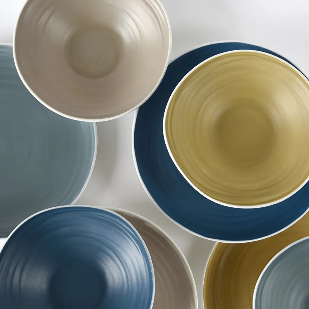 One of the emblematic white collections, Belle Ile, is here revisited with colors. The soft, luminous pastels and sharp blues blend elegantly with this organic and timeless line. Belle Ile gives an illusion of movement, reminiscent of the imprint of a ceramicist or of water ripples.