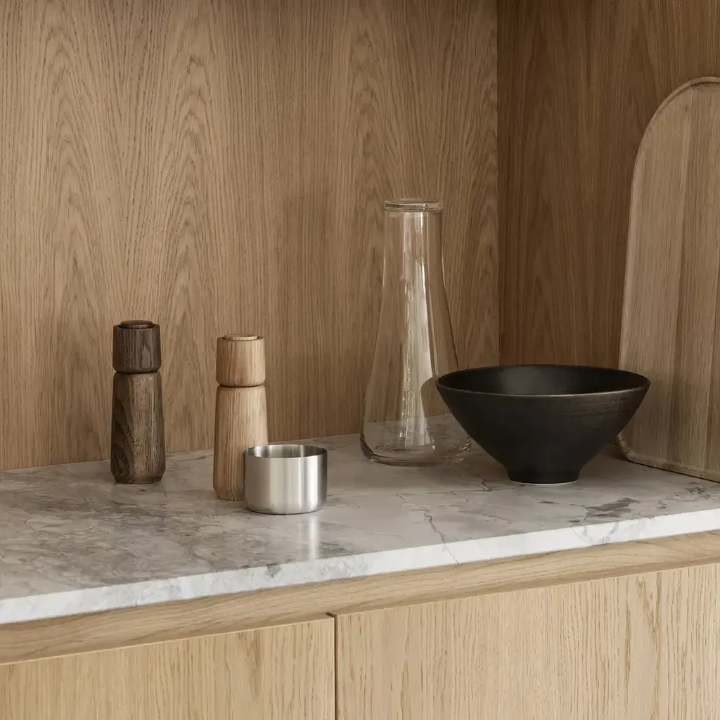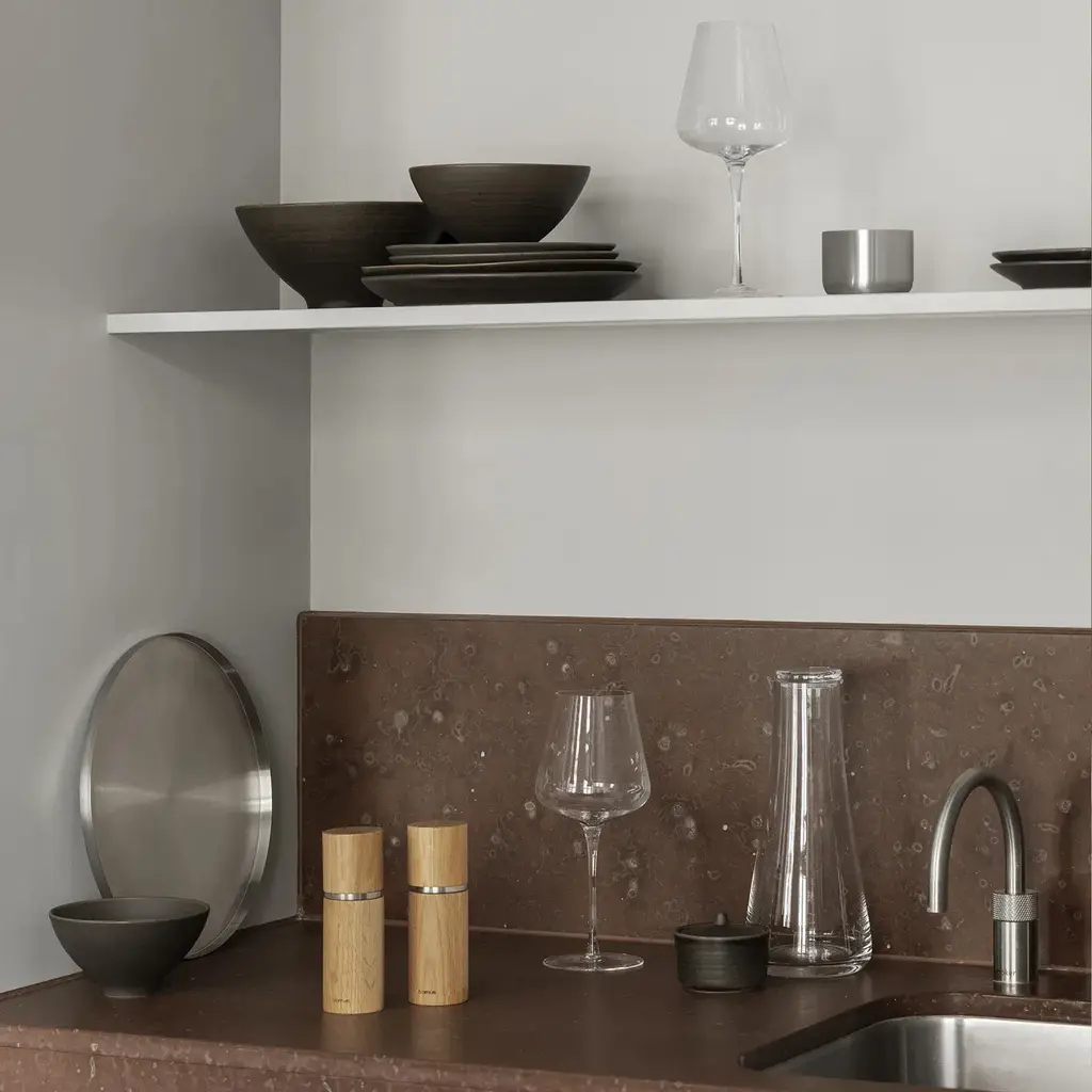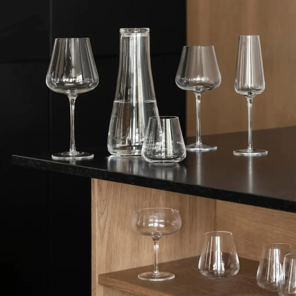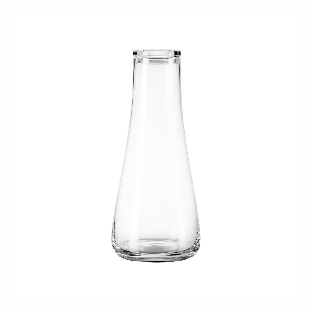 Mouth-blown in clear glass, the BELO carafe keeps the table quietly refined. The tapered silhouette pours in a smooth, steady line, and the matching glass lid keeps water dust-free between refills. At 40.9 fl oz (1.2 L), it’s sized for dinner service without constant trips to the sink. Dimensions: 10.2″ x 4.5″ or 26 cm x 11.5 cm. Because each piece is made by hand, you may notice tiny bubbles or faint flow lines—subtle signs of the process that give the carafe its own character. Designed by Frederike Martens for blomus. Dishwasher safe. Pair it with BELO tumblers and stemware for a coordinated setting, or keep it solo on a nightstand or desk; the simple form works anywhere.