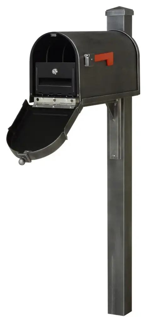 The Berkshire Curbside Mailbox presents an impressive face. The one piece cast aluminum door features deeply cut details with a rich, leather grain textured panel. The stainless steel spring hinge and magnetic catch will keep the door secure and the rust proof cast aluminum body construction creates a weather resistant mailbox. The Wellington Series Mailbox Post features a 3" x 3" x 72" smooth square post. Made entirely of aluminum with stainless steel components to eliminate rusting. Direct burial installation is required.This mailbox combination also includes an easy to install locking insert, to help protect from identity theft. Manufactured from rust free powder coated aluminum, the Lock Box firmly attaches to the bottom of the mailbox and cannot be removed without the key. The Lock Box insert is easily installed with four screws (included). Consult your local postmaster regarding regulations governing the installation of locking inserts.