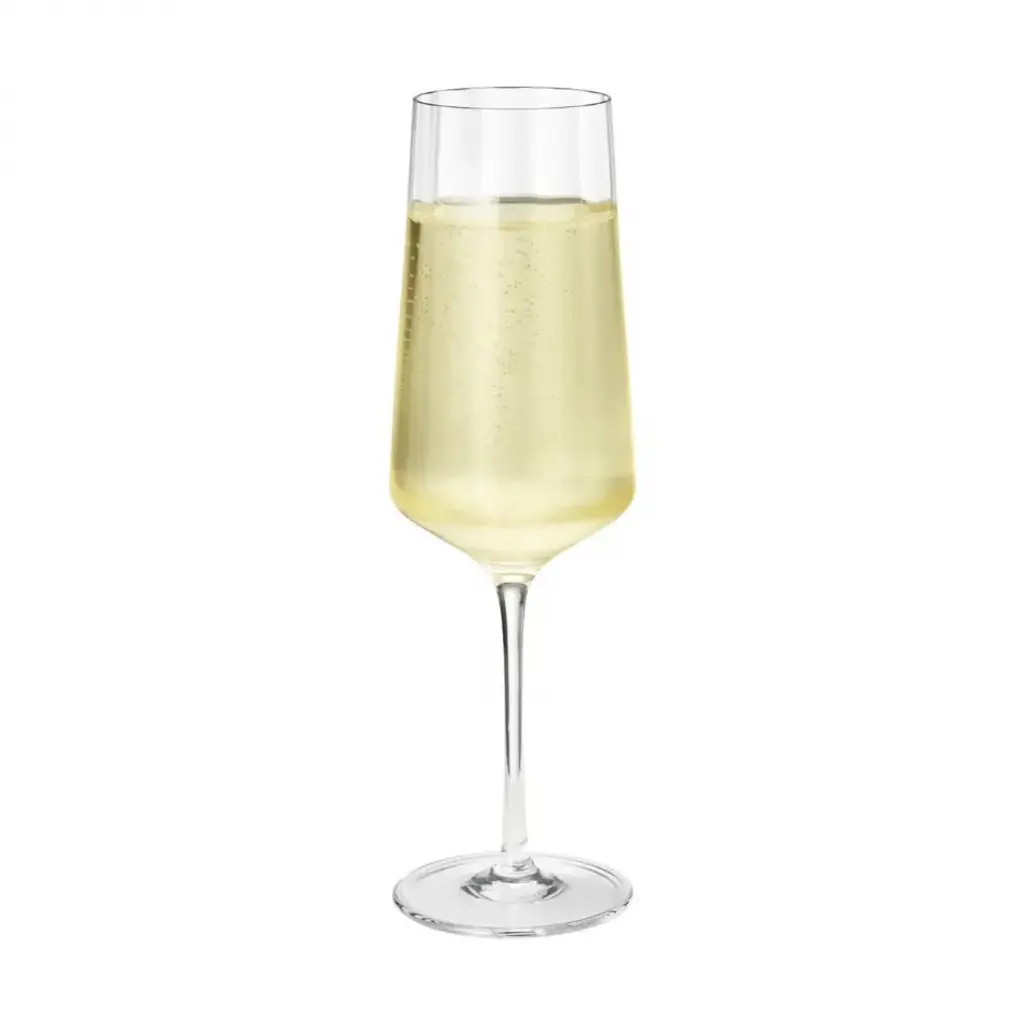 The grooved and geometric lines that have come to define Sigvard Bernadotte's design language can be found in this striking set of champagne glasses. Crafted in crystal, these stunning glasses make for a striking champagne toast and finger food pairing whatever the occasion.