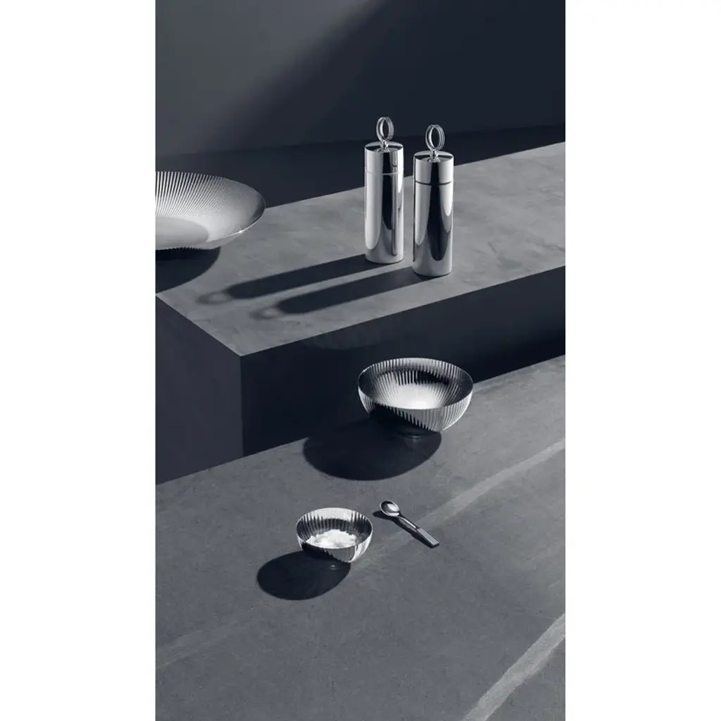 Georg Jensen's Bernadotte salt cellar and spoon are made of stainless steel and decorated with delicate grooves. Besides salt, the bowl can be used for serving dips and sauces. The Bernadotte collection is a true Scandinavian design icon, and even today one of the most popular Georg Jensen collections. The elegant collection is named after its original designer, the Swedish Prince Sigvard Bernadotte. The first products in the collection were designed in the 1930s when the design world was heavily influenced by the functionalist movement. Characteristic to both the era and the designer, Bernadotte beautifully combines practicality to clean-lined elegance. Bernadotte is the perfect choice for all design enthusiasts who value quality and beautiful, timeless design.