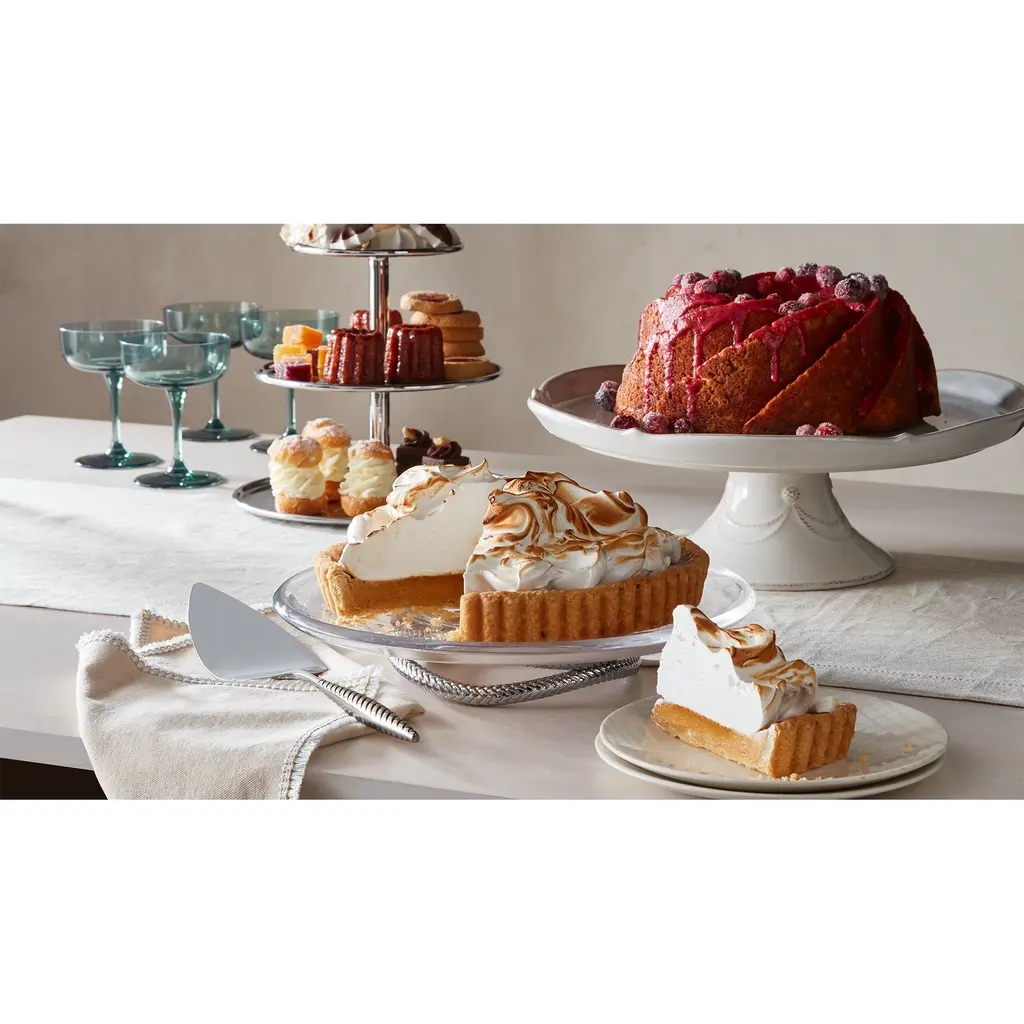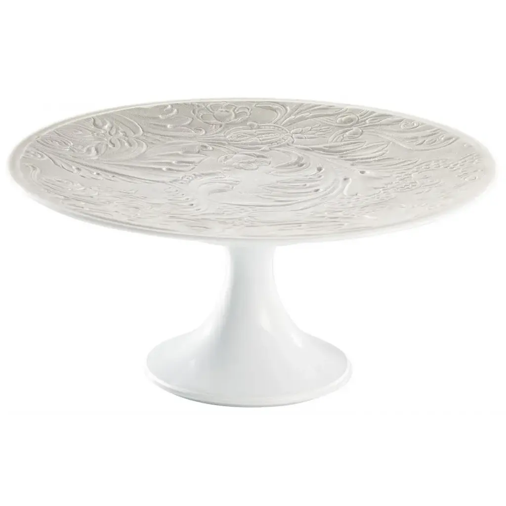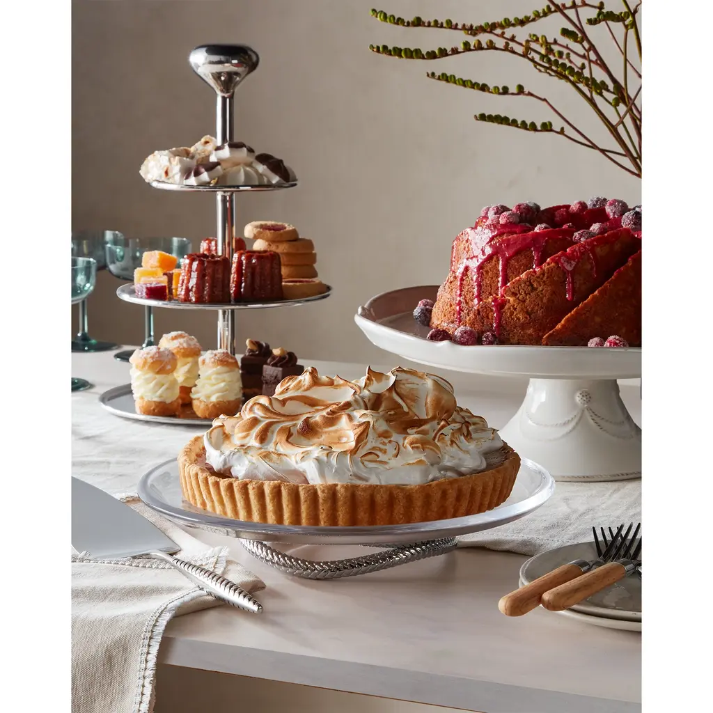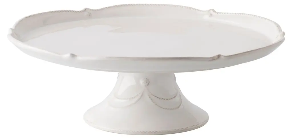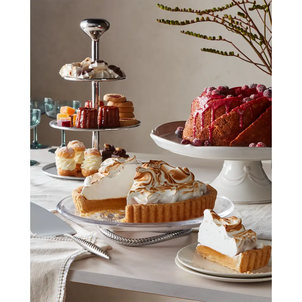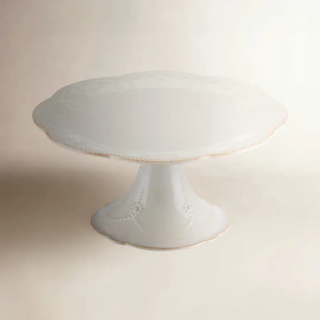 A scalloped silhouette and crisp white finish makes this cake plate a classic centerpiece for your festive tabletop.