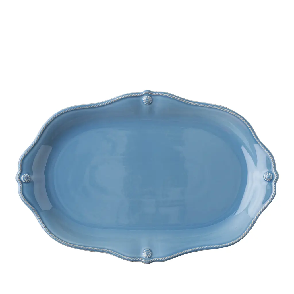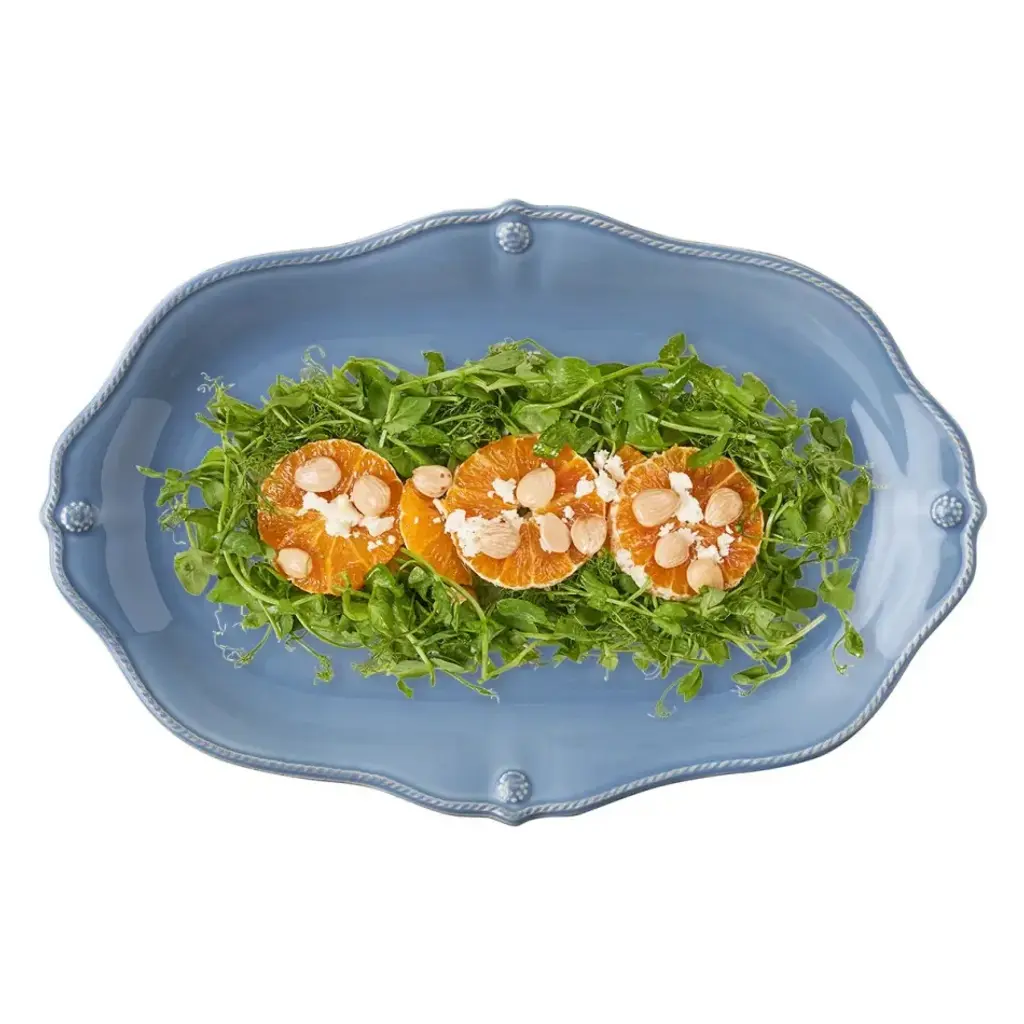 From our Berry & Thread Collection - Rimmed with a simple thread and adorned with a sprinkling of berries, this iconic dinnerware collection embraces historic motifs in a sublime blue hue. This 16 in. platter, with a subtly scalloped edge is perfect for serving a few or a feast, and goes seamlessly from oven to table. Based in Connecticut, Juliska is committed to bringing elegant European design into our modern homes. Since its founding in 2001, when David and Capucine Gooding began by working with artisans outside of Prague to reproduce antique Bohemian glass pieces, every piece from Juliska has shared a rich heritage spanning six centuries of European design. Juliska's creations are timeless, romantic and effortlessly chic.