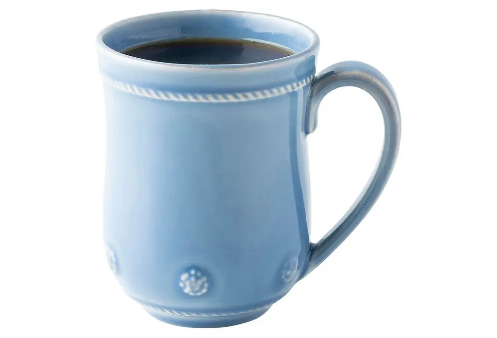 Crafted of stoneware and glazed in a chambray-blue finish, this mug is decorated with a textural thread detail and berry motifs along its scalloped rim, offering a fresh take on a classic, versatile design.