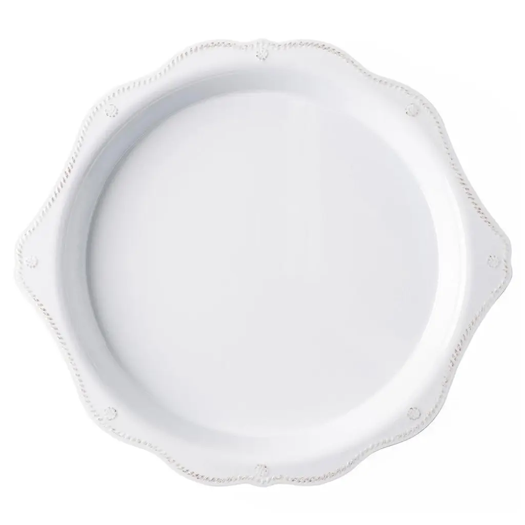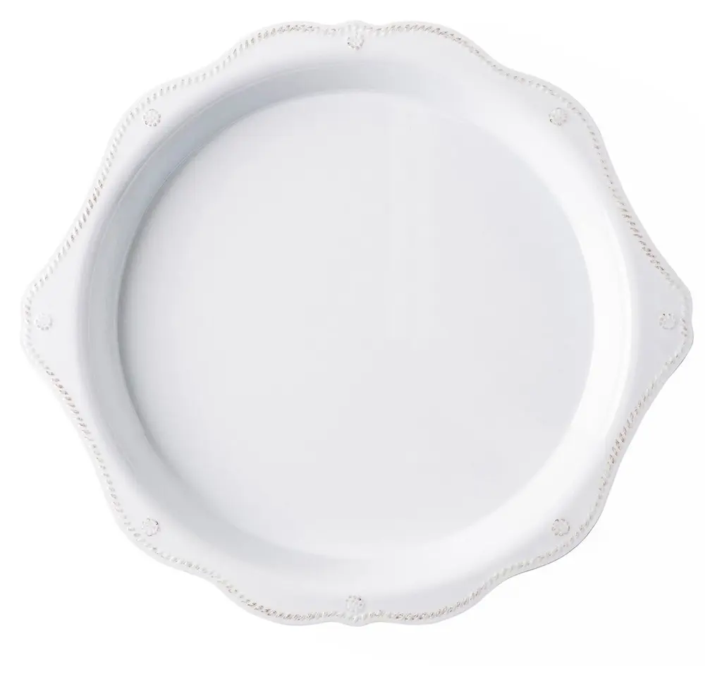Crafted of stoneware and glazed in a whitewash finish, this platter is decorated with a textural thread detail and berry motifs along its scalloped rim, offering a fresh take on a classic, versatile design.