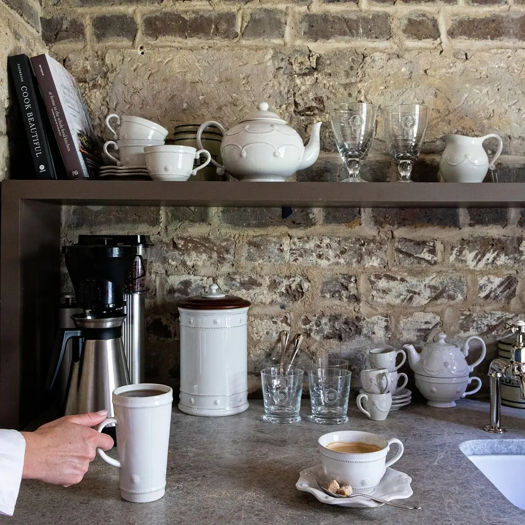 Conveniently microwave and dishwasher safe, this teacup is crafted of stoneware with textural thread detailing, berry motifs, and a versatile whitewash finish.