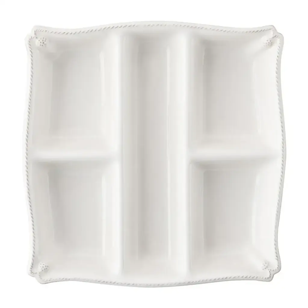 From our Berry & Thread Collection - Wayward crackers be gone - with this pretty and practical square-shaped serving platter that organizes tasty tidbits with style and grace. A central avenue is flanked by four compartments that makes it blissfully easy to present a row of crackers down the middle, surrounded by a selection of accouterments. Based in Connecticut, Juliska is committed to bringing elegant European design into our modern homes. Since its founding in 2001, when David and Capucine Gooding began by working with artisans outside of Prague to reproduce antique Bohemian glass pieces, every piece from Juliska has shared a rich heritage spanning six centuries of European design. Juliska's creations are timeless, romantic and effortlessly chic.