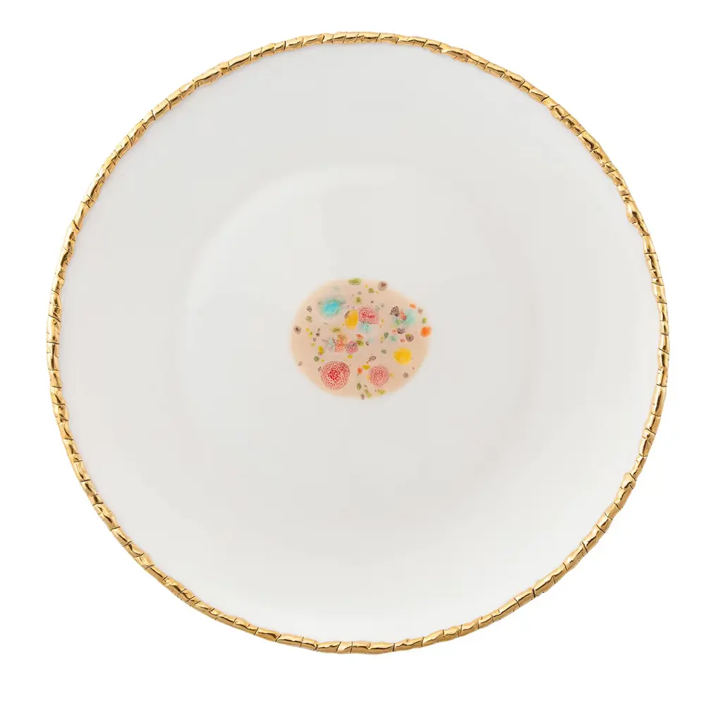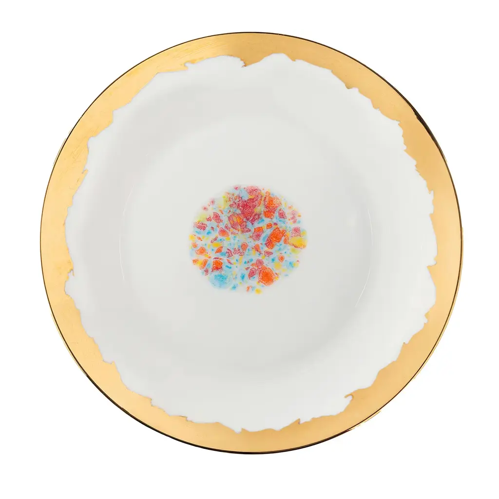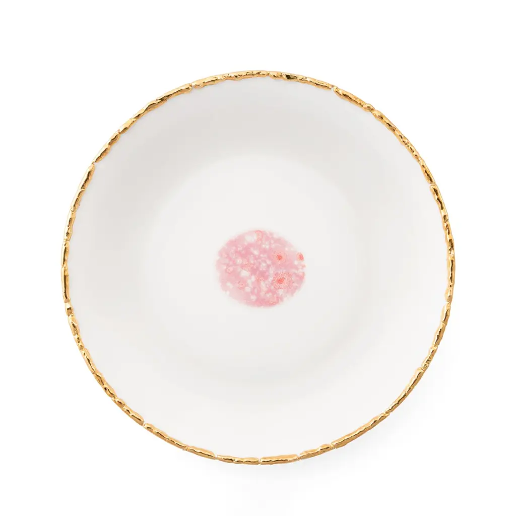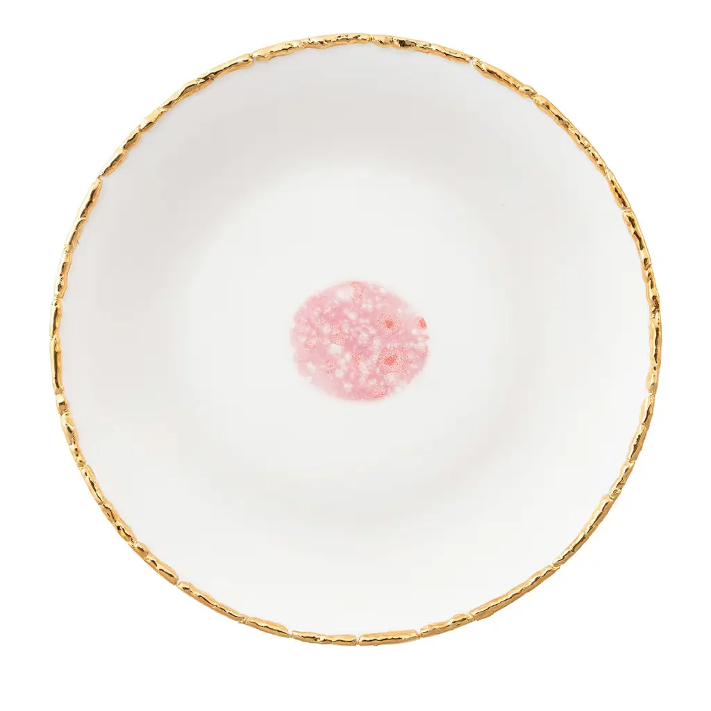 First introduced at Milan Design Week 2018, this stylish porcelain set of two soup plates will give a distinctive artistic allure to any table set for two. Each plate is characterized by a one-off decoration of dappled pink specks gracing the center, encircled by a bright craquelure border in 24K gold leaf for a dash of traditional opulence. Minutely painted by hand and inherently unique. Not suitable for microwave use.