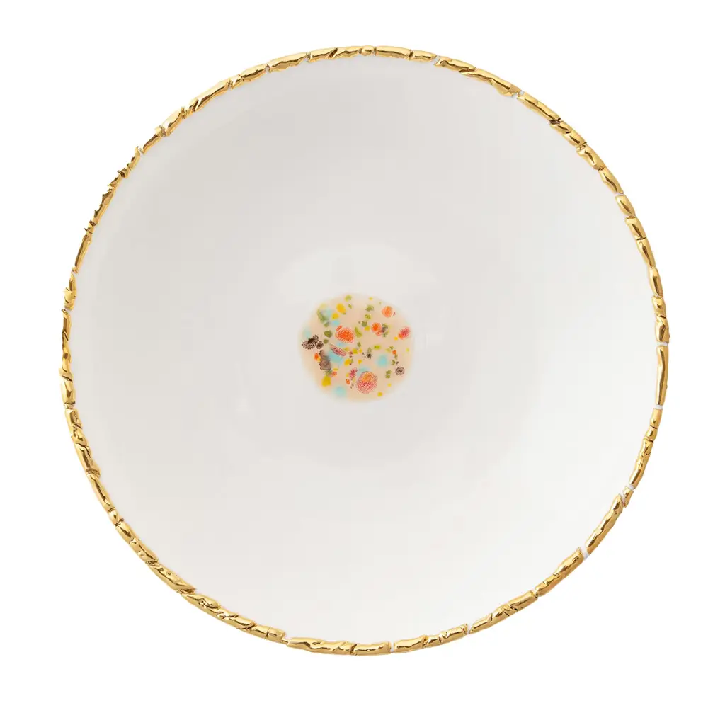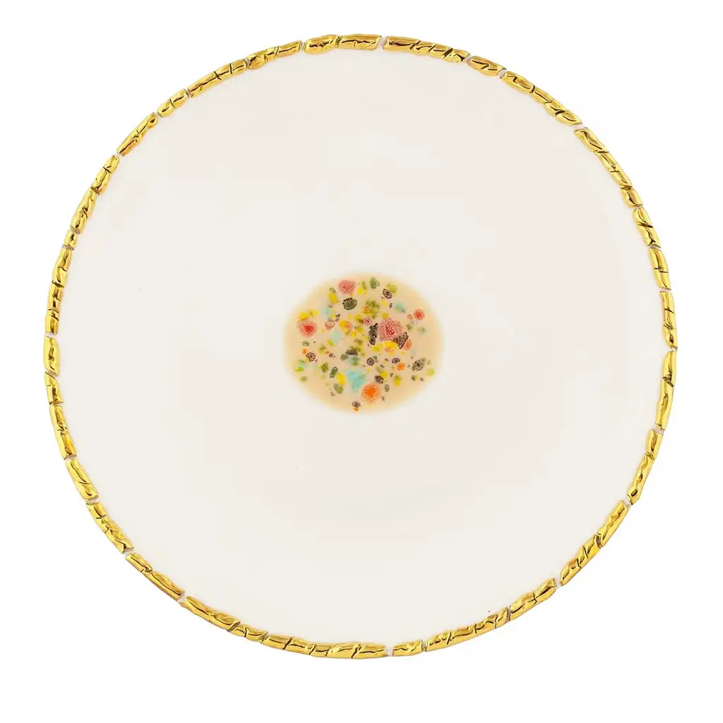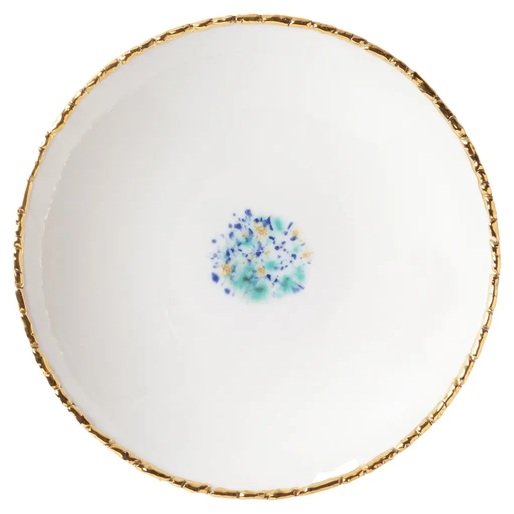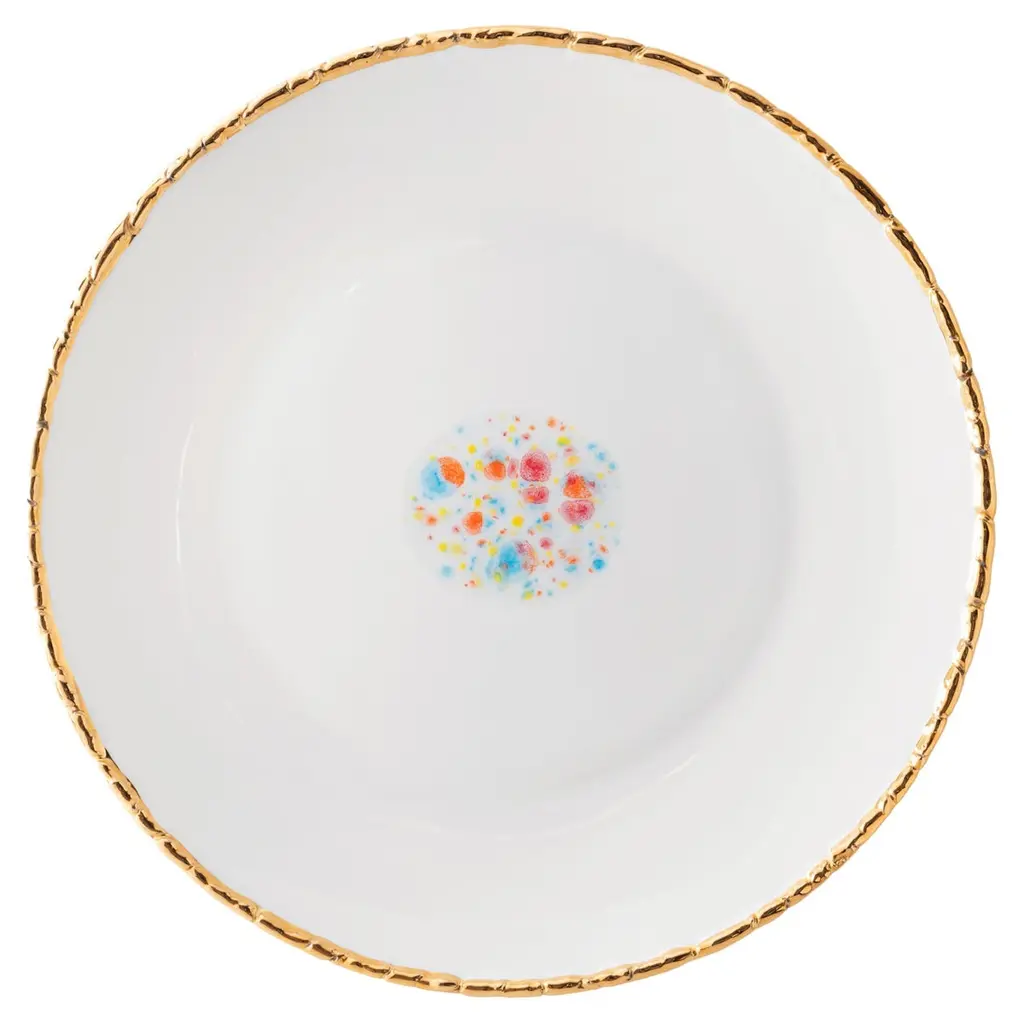 First introduced at Milan Design Week 2018, this stylish porcelain set of two soup plates will give a distinctive artistic allure to any table set for two. Each plate is characterized by a one-off decoration of dappled pink specks gracing the center, encircled by a bright craquelure border in 24K gold leaf for a dash of traditional opulence. Minutely painted by hand and inherently unique. Not suitable for microwave use.
