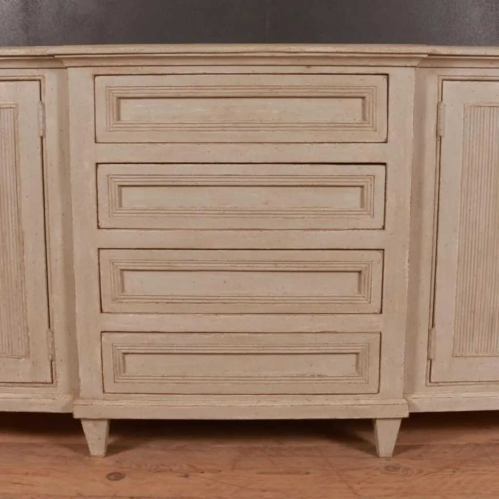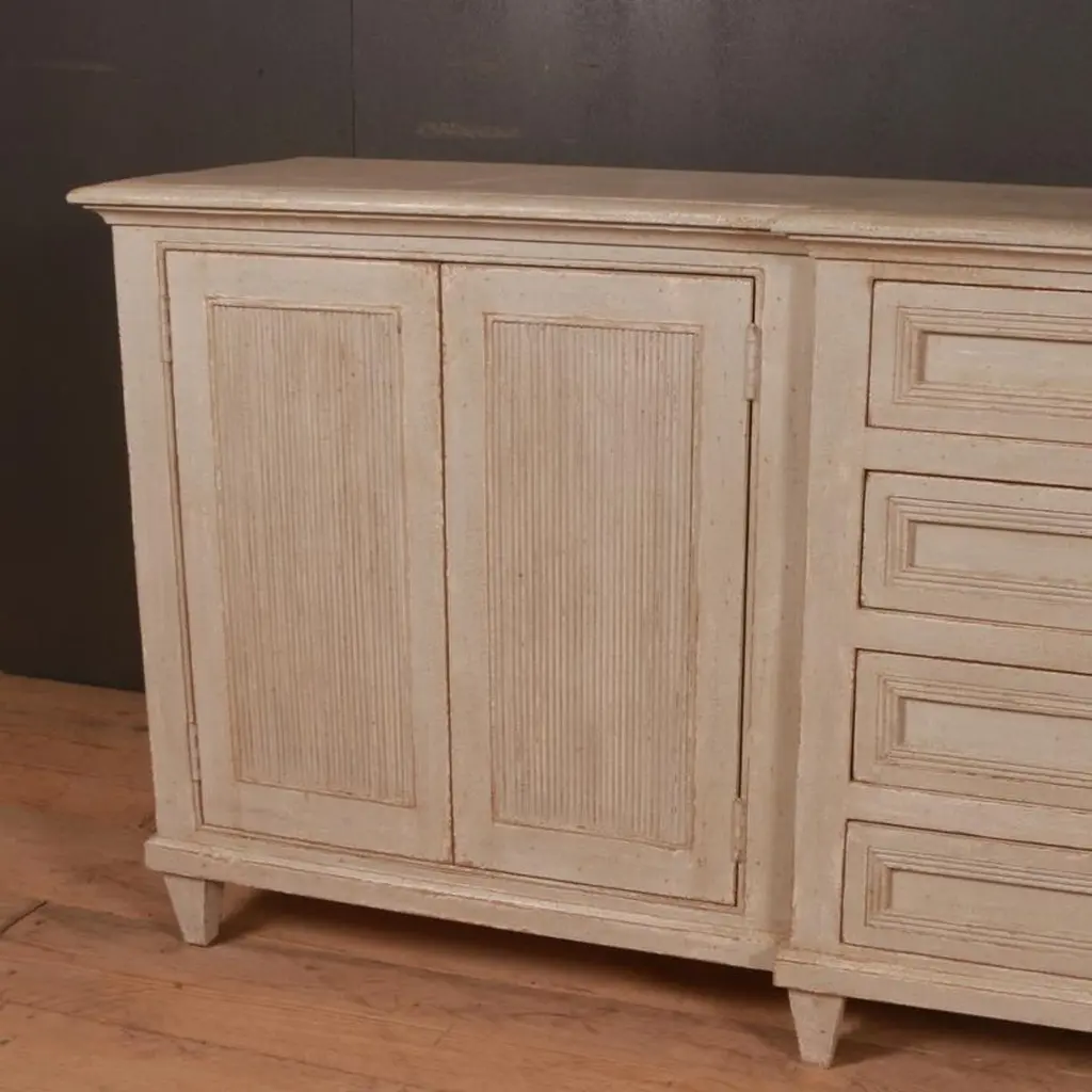 Custom made Swedish style breakfront sideboard. This can be made to your size and paint color.Dimensions:87 inches (221 cms) wide18.5 inches (47 cms) deep34 inches (86 cms) high.