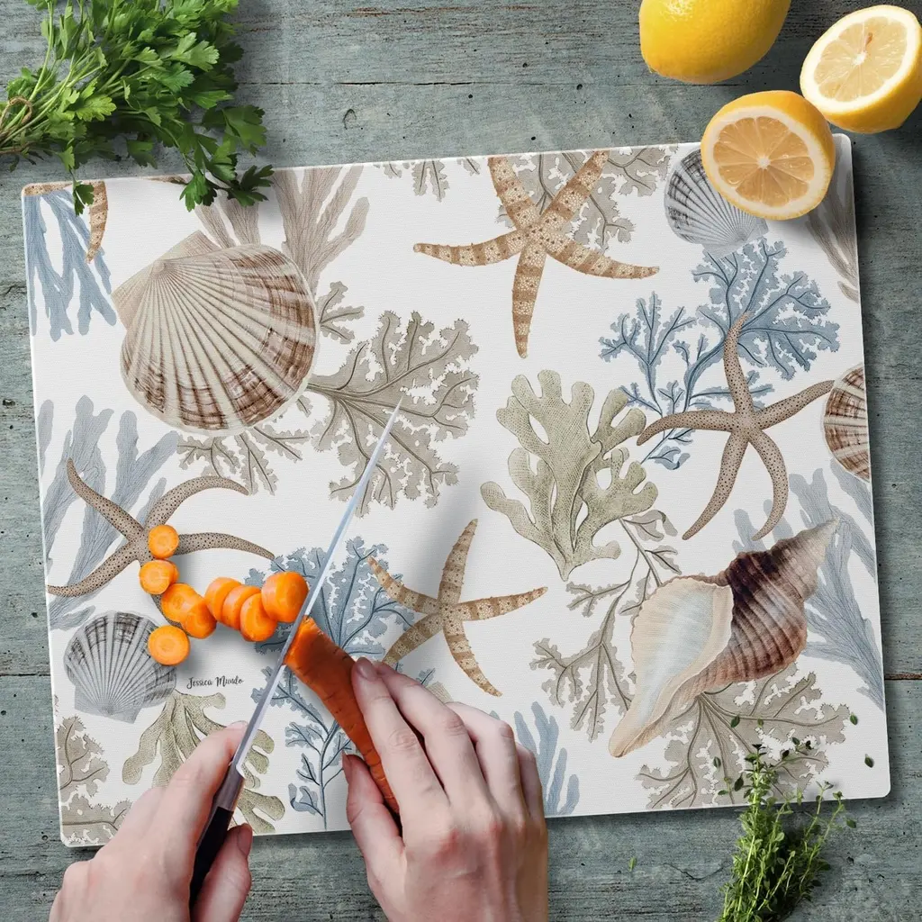Beyond The Shore 3mm Heat Tolerant Tempered Glass Cutting Board. Manufactured in the USA. Great for food preparation, cutting and serving. Made of high quality 3mm Tempered Glass that is safe for temperatures up to 400 degrees F or 204 degrees C. Measures 15" x 12". Non-Skid Rubber Feet included on back of the board to prevent movement of the board when in use. Protects your surfaces from scratches and stains when preparing food. Artistic design allows the Cutting Board to remain displayed when not in use. Adds color and distinction to your space. Cutting Board is dishwasher safe.