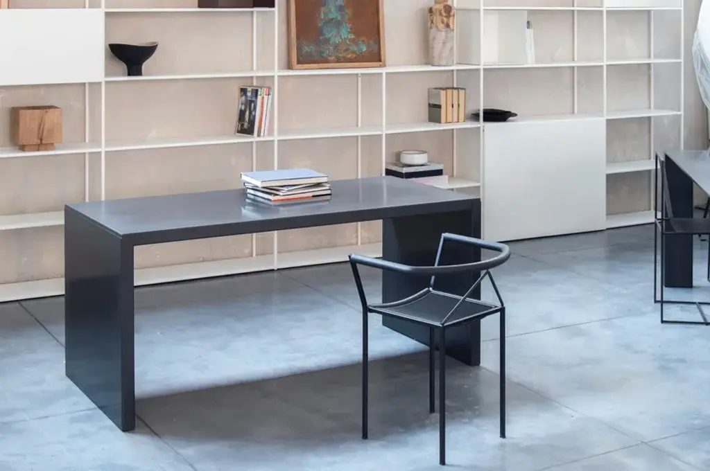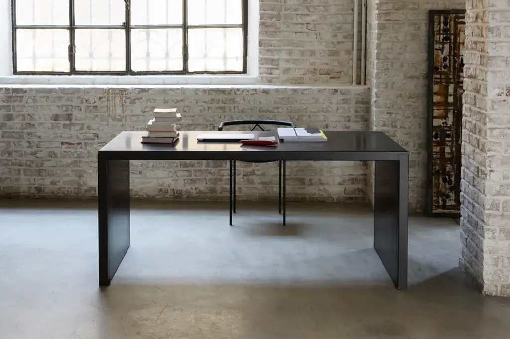 Big Irony is a rectangular metal desk.Frame/top: Black phosphatized sheet steelCharacteristics and maintenance instructions:BIG IRONY products have intentionally not been painted because it is the surface irregularity the characteristic which makes them so special. The daily use will form stains forming a patina which renders the surface even more beautiful. To clean it use a non aggressive/soft detergent as it would be wood.