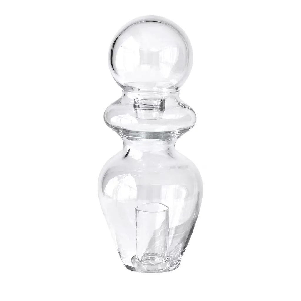 The Bilia Bottle from Zafferano America is handcrafted from colored borosilicate glass, designed to withstand thermal shock. This piece evokes memories of childhood days spent at the beach, where kids played marbles on the shore, carefully keeping them "on track." This item brings a playful yet elegant touch to any setting, both functional and nostalgic.