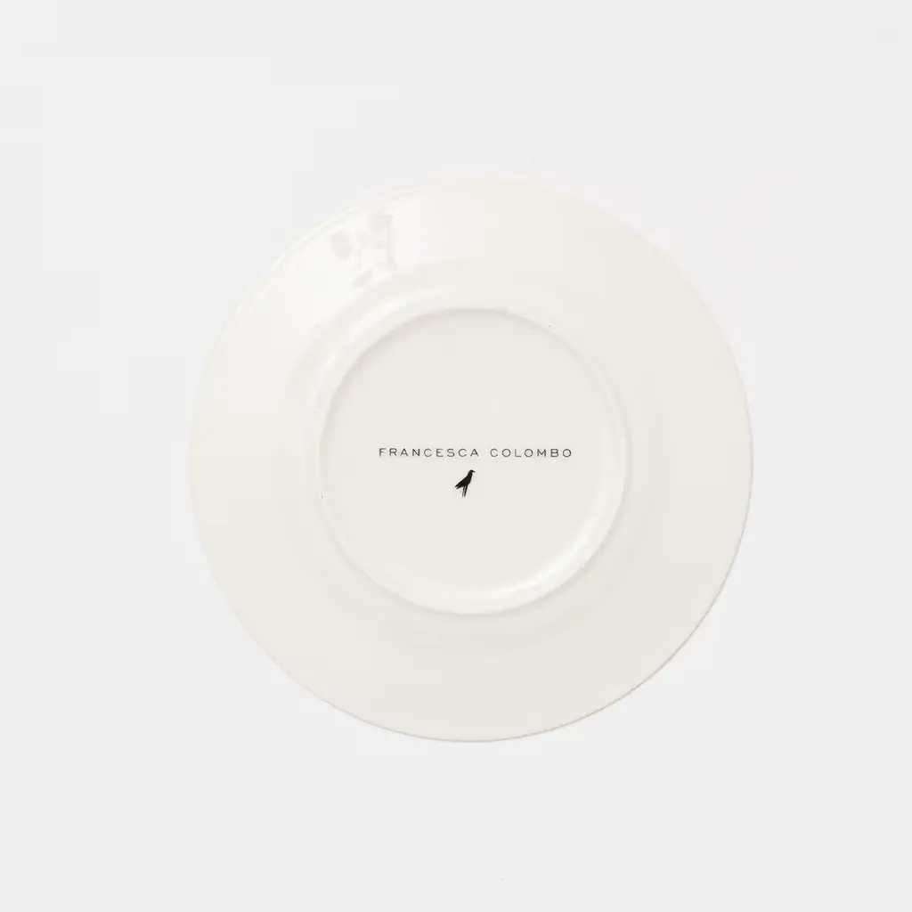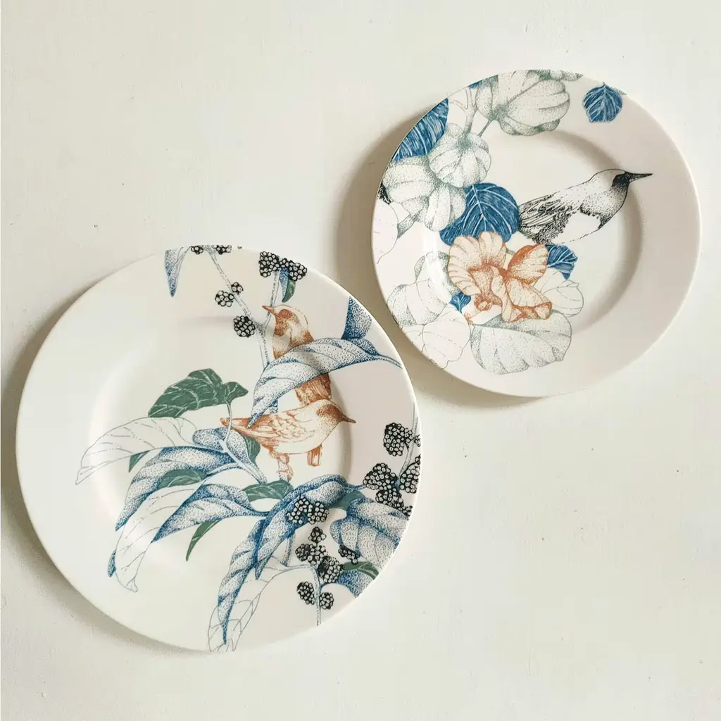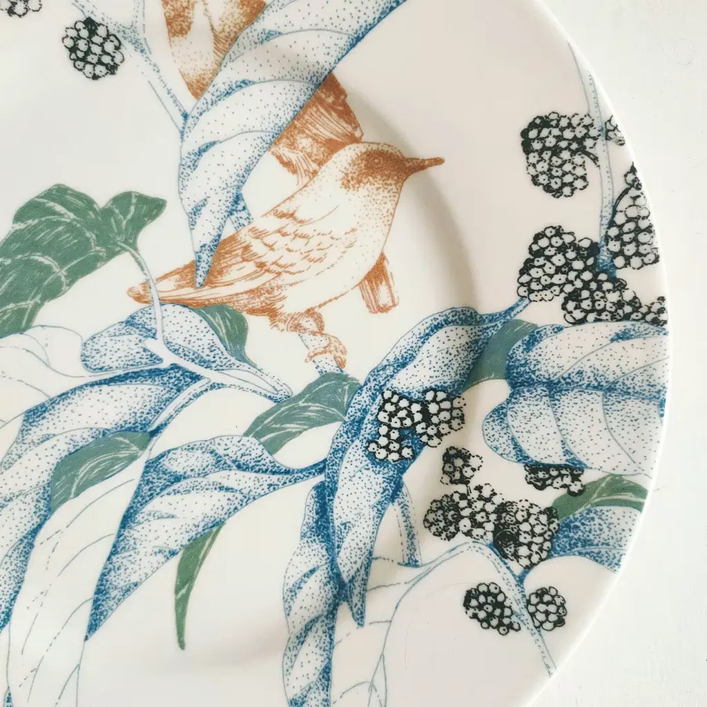 This fine porcelain dessert plate is offered in a refined palette of blue, green, and terracotta tones. It features a romantic illustration capturing a glimpse of the woods. Luxuriant foliage surrounds the pair of wild birds perched on twigs, an illustration made initially following the pointillism technique and rendered in exquisite details. The piece is both oven- and dishwasher-safe.