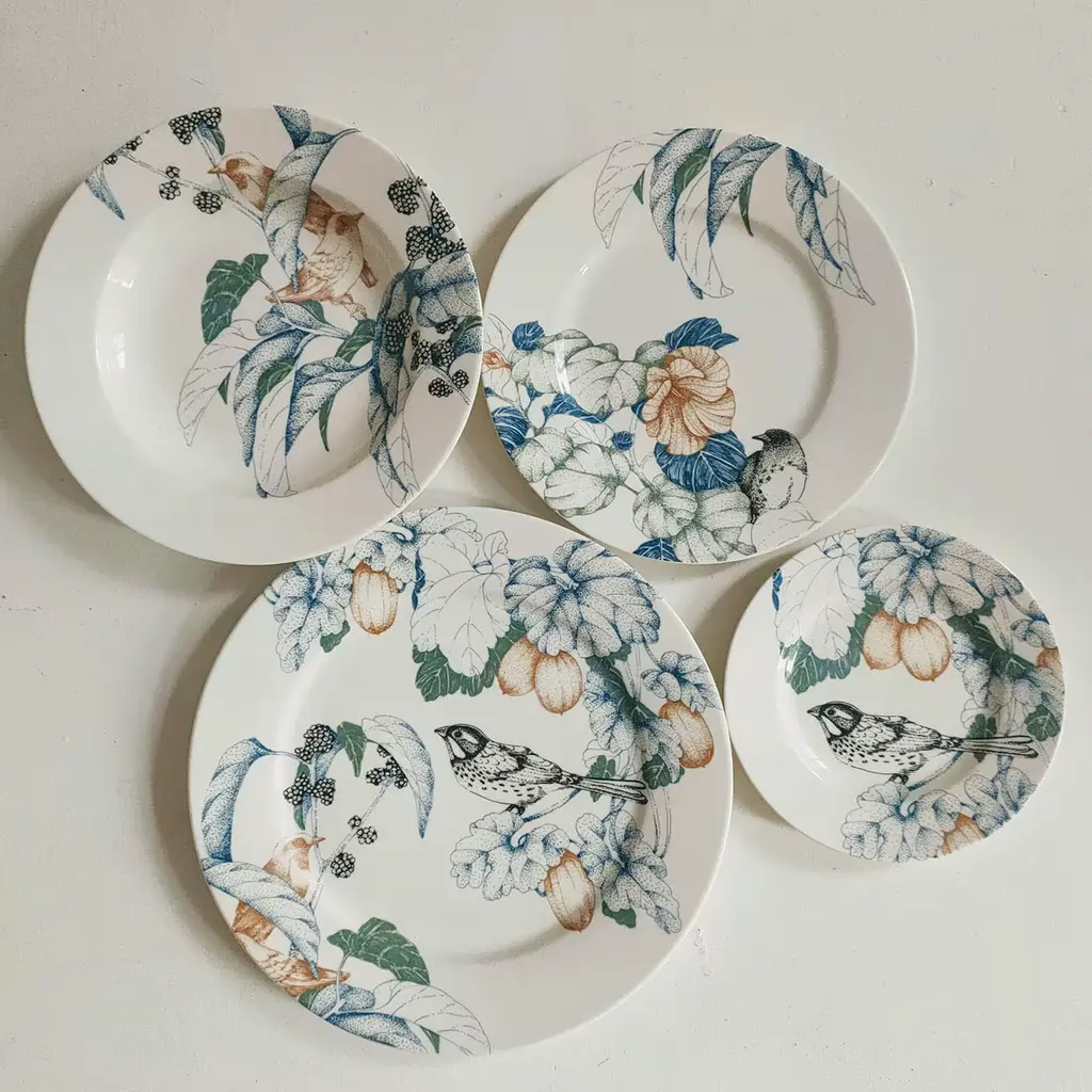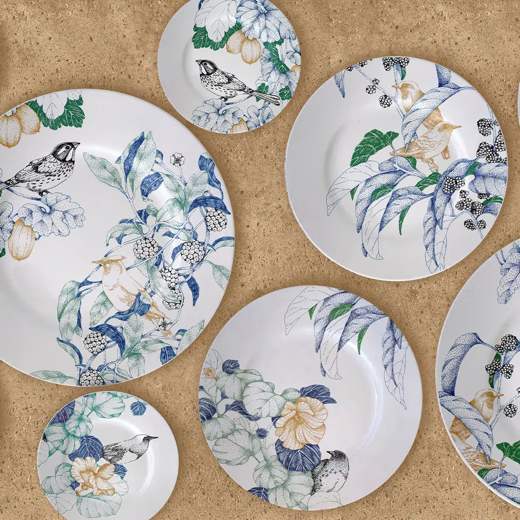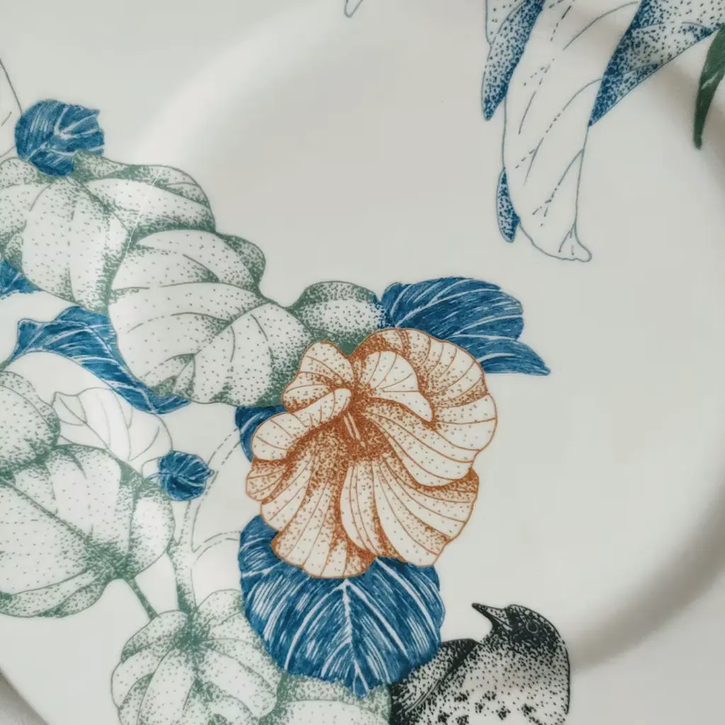 Romantic and sophisticated, this fine porcelain dessert plate seduces with its elegant tones and minute details of its nature-inspired decoration. Originally developed with the pointillism technique, the illustration offers a glimpse of intricate foliage wild birds try to hide among. Each plate is a singular, hand-decorated work of art that will shine in any home or kitchen decor. Oven- and dishwasher-safe.