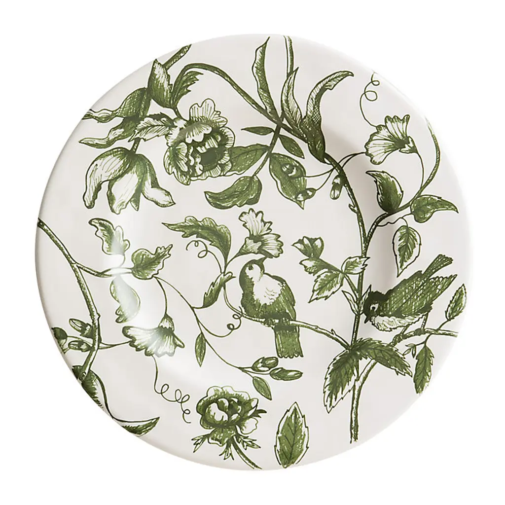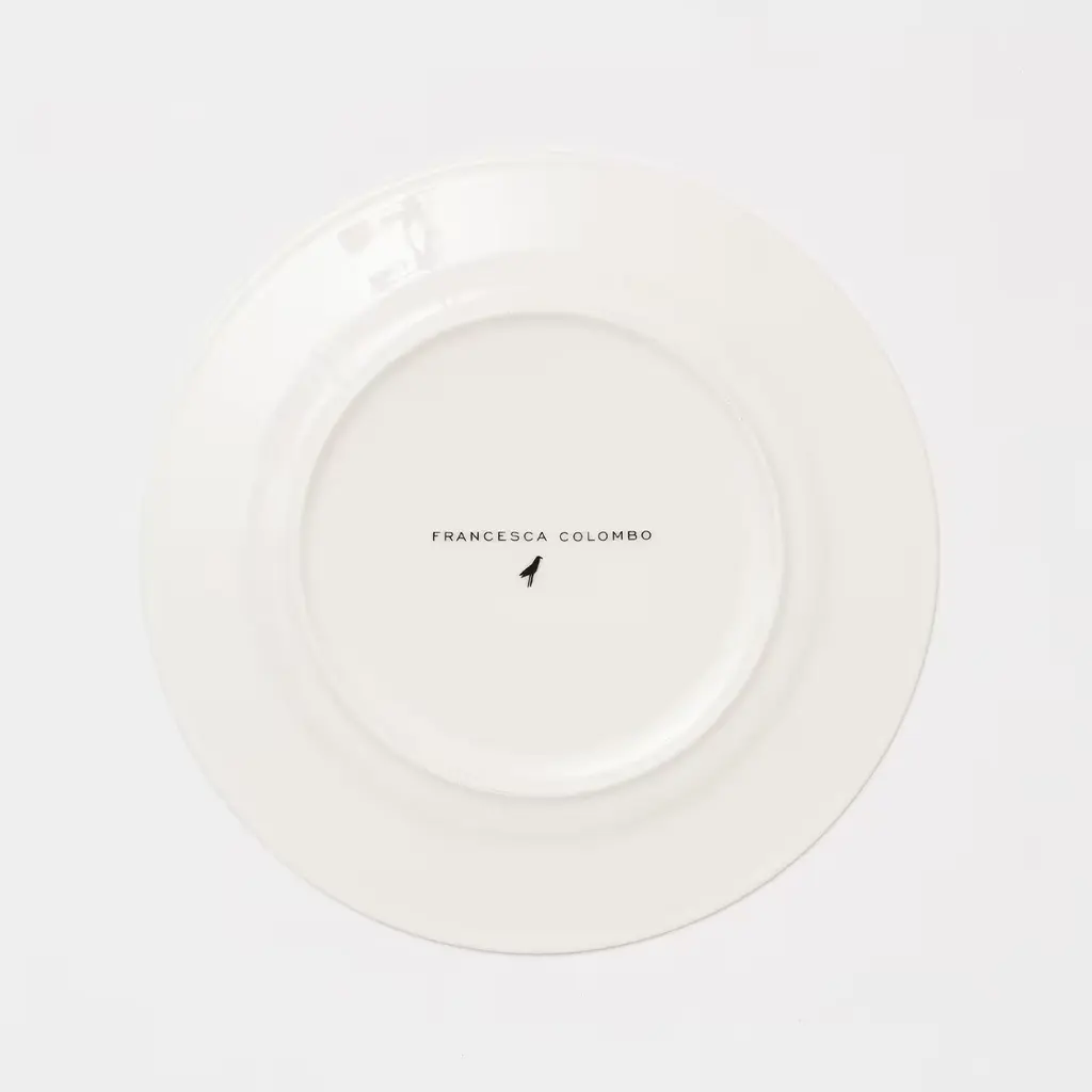 A minute and romantic illustration initially developed with the pointillism technique decorates this superb porcelain dinner plate with a glimpse of the woods. Perched on blossoming twigs, a couple of wild birds complete the scene, its femininity enhanced by a delicate color palette combining shades of terracotta, blue, and green. Each piece is oven- and dishwasher-safe, qualities that add to its artisan uniqueness.
