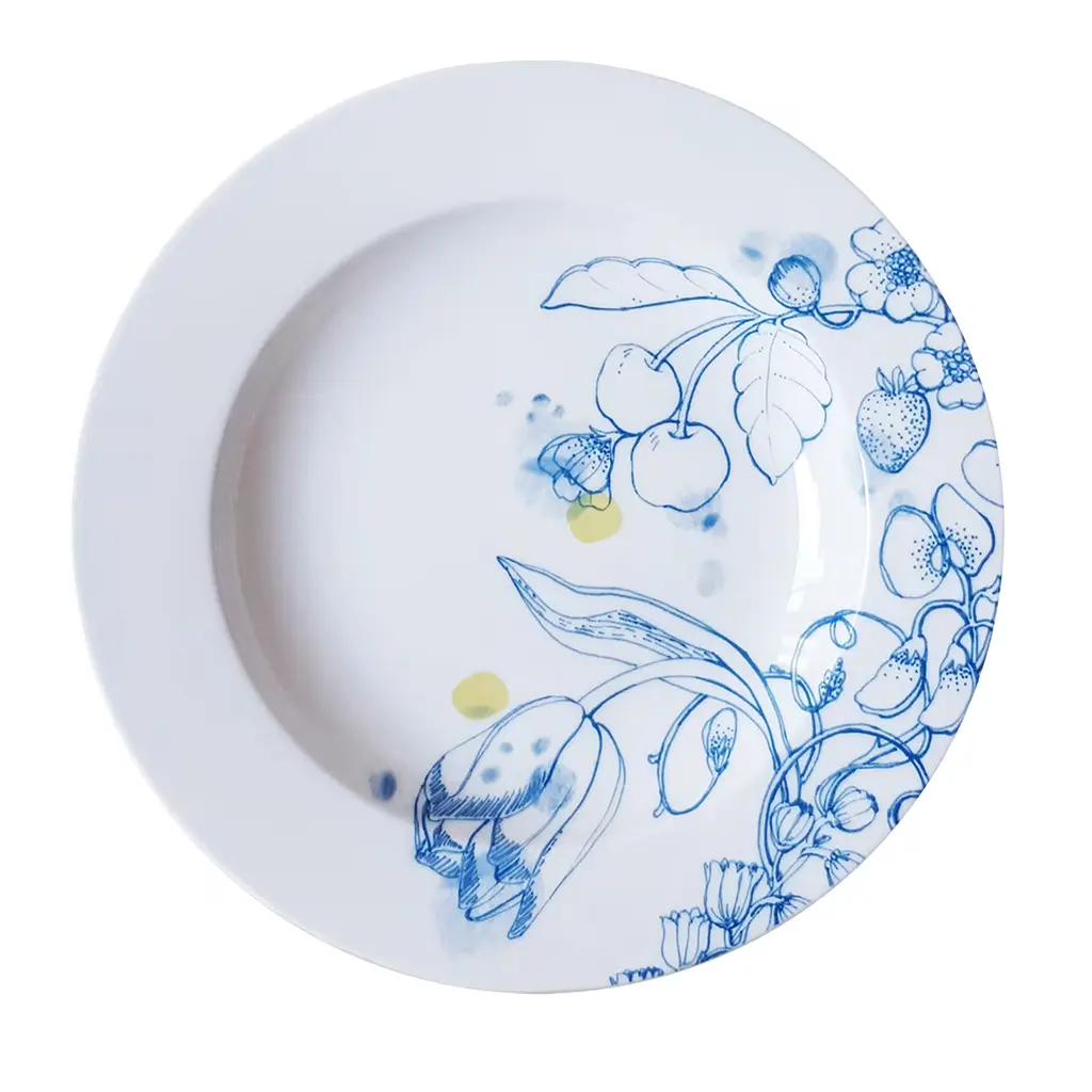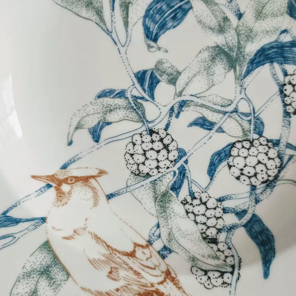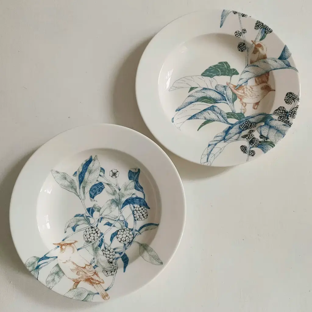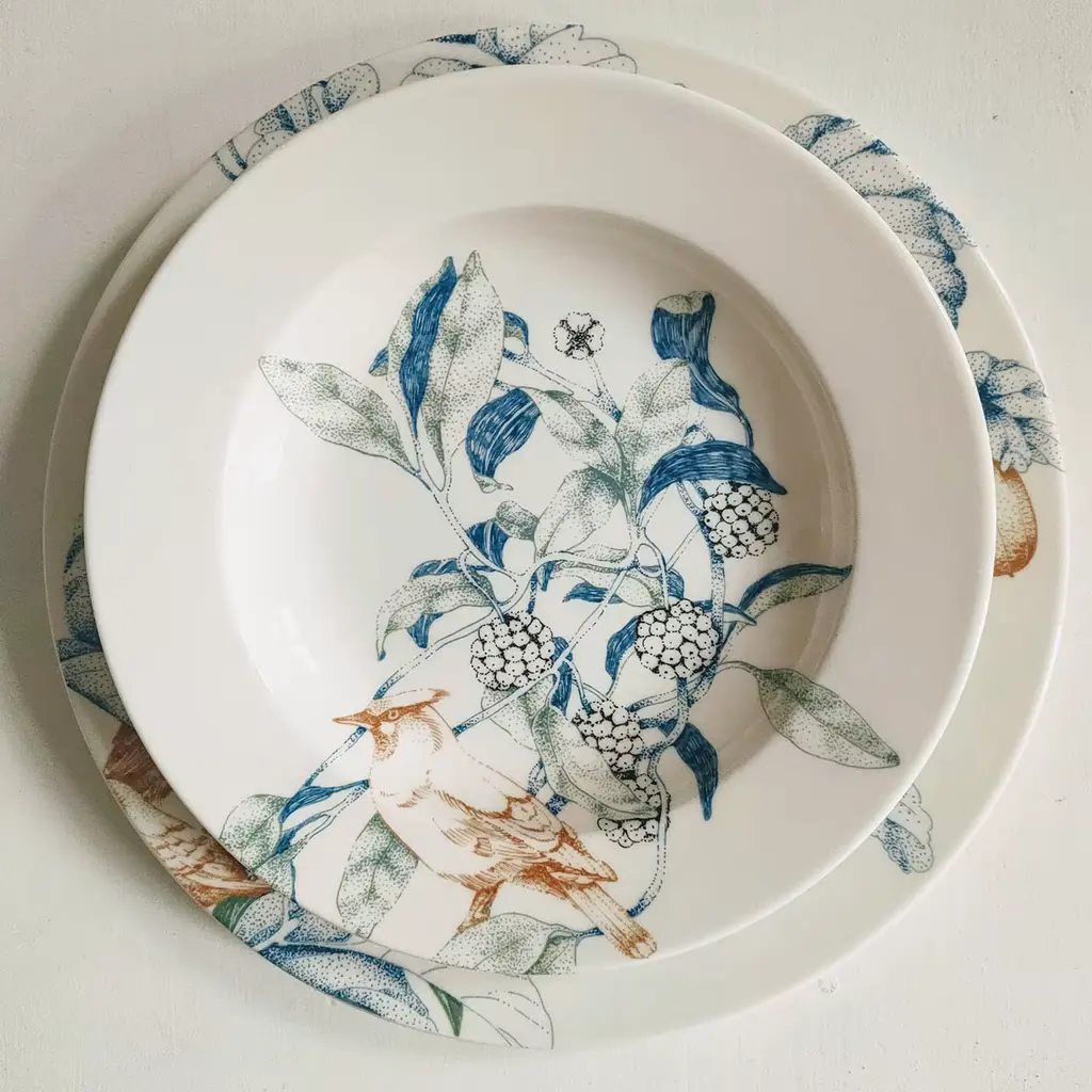 A poetic glimpse capturing wild birds while seeking shelter in the midst of luxuriant foliage is the decoration adorning this romantic set of two porcelain soup plates. Oven- and dishwasher-safe, the plates boast a fresh chromatic palette where shades of blue combine with dusty green and terracotta to reinforce their artistic personality. Originally obtained with the pontillism technique, the decorations are precious odes to nature.