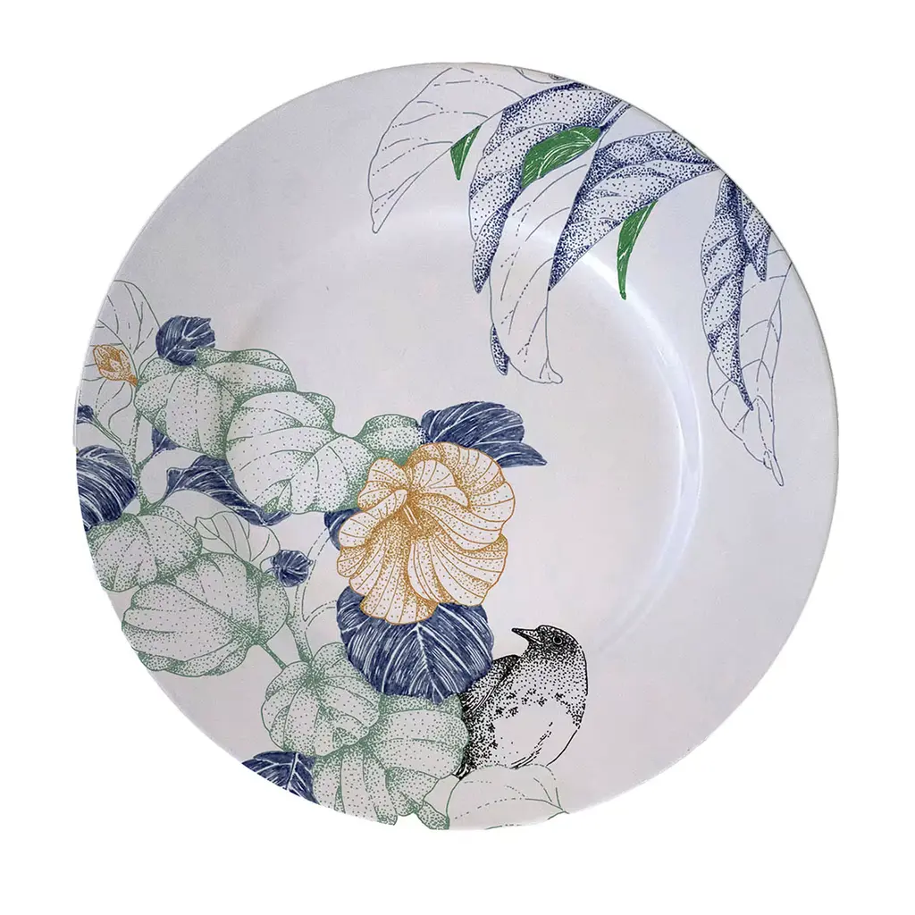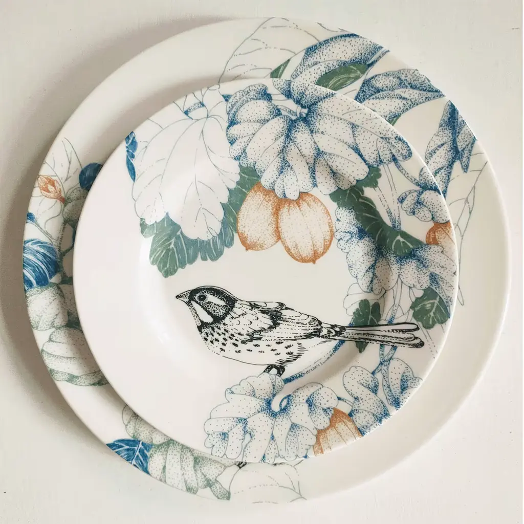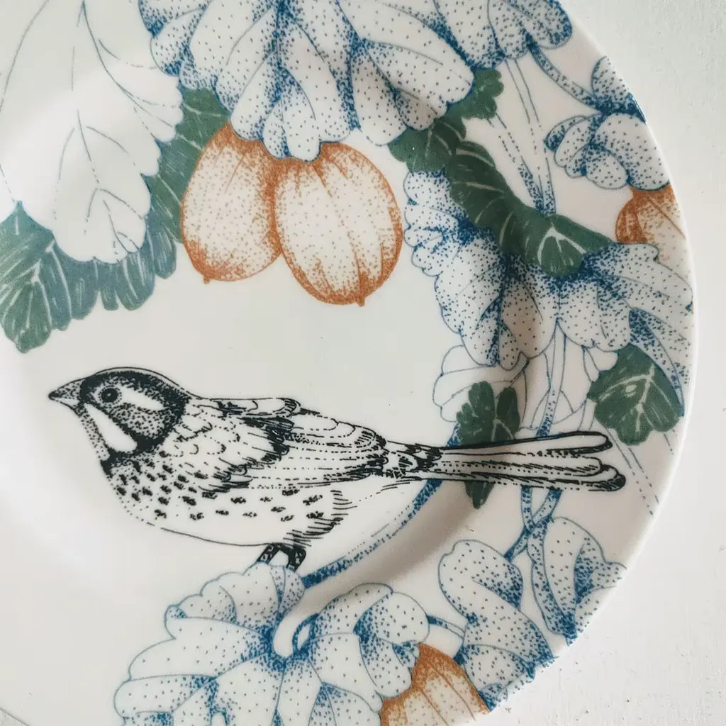 A poetic glimpse of the woods - where wild birds are depicted while trying to hide among luxuriant foliage - adorns this precious white porcelain set of two bread plates. Originally developed using the pointillism technique, the illustration boasts minute details and sophisticated tones of green, blue, and terracotta, sealing the set's elegant femininity. Handcrafted and unique, the plates are both oven- and dishwasher-safe.