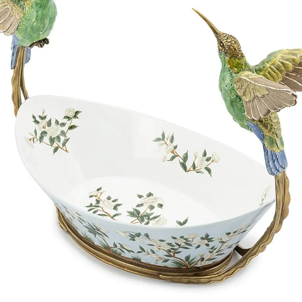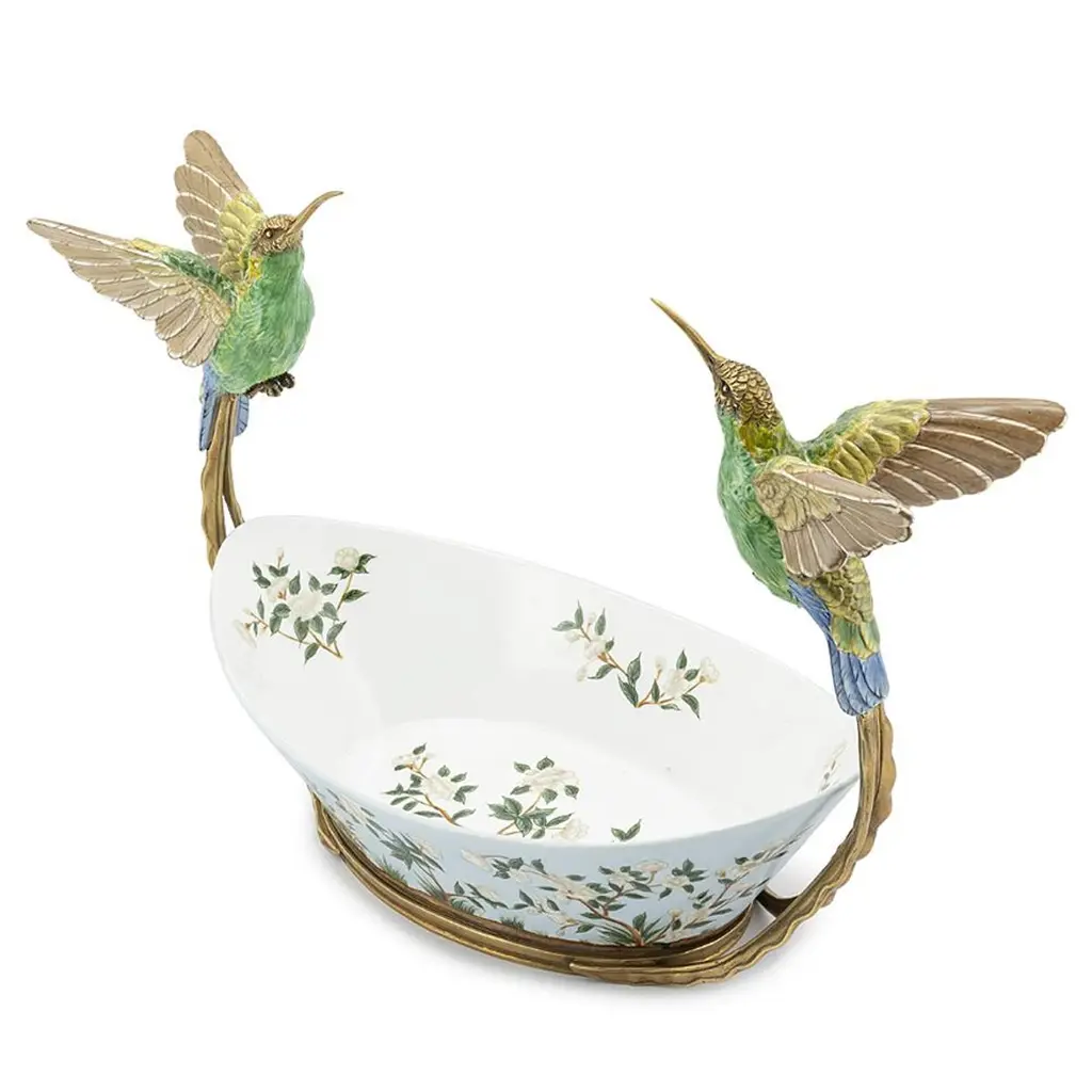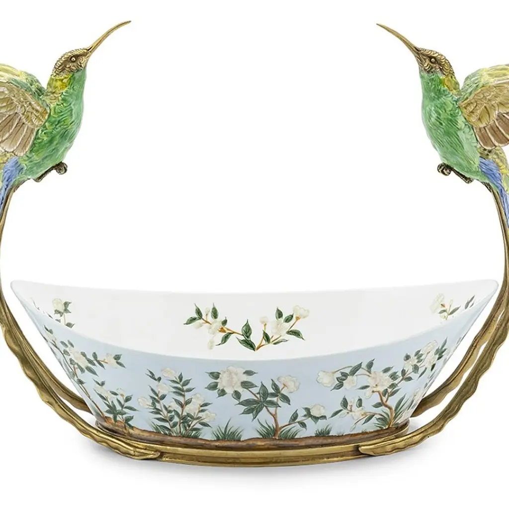 Bowls birds Porcelain hand-painted in whiteporcelain with a bronze frame. With 2 birdsin porcelain, hand-painted and with bronze head and beak.