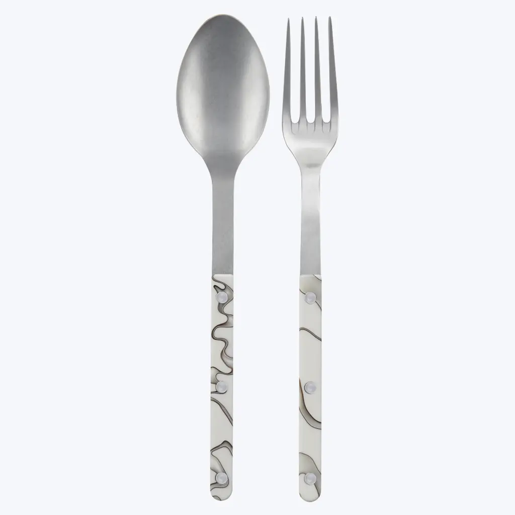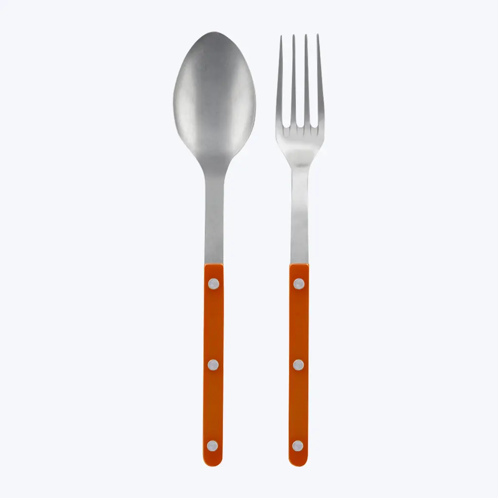 The Bistrot Vintage Finish 2-Piece Serving Set is true to its namesake with design inspiration coming from the Sabre team's favorite restaurants, cafes, and terraces in France. When designing this serving set, Sabre wanted to faithfully capture the bistro atmosphere while adding a modern touch: the styling is simple, the rivets are visible, and each color and material stand out nicely. These 18/10 stainless steel serving utensils feature a vintage finish for a more authentic and rustic appeal. This 2-piece Sabre serving set is comprised of a large fork for serving meat and a large spoon for accompaniments, a vital day-to-day kitchen accessory.Sabre Paris serves as more than just cutlery, it is a representation of decorative objects for the everyday table. For over 30 years, Sabre has provided tables around the world with softened yet understated and functional shapes, designed to fit perfectly in the hand. This collection of flatware is where chic French style and whimsy co-exist. Further Care Details:The Bistrot Flatware Collection is dishwasher safe at 45°C/113°C maximum. Remember to open the dishwasher at the end of the cycle. When washing by hand, Sabre recommends that you do not use abrasive sponges. For cutlery with light-colored handles, avoid prolonged contact with foods that stain such as coffee, tea, tomato sauce, etc. If small rings appear on the knife blades, they can be easily removed with a soft cloth and/or white vinegar.