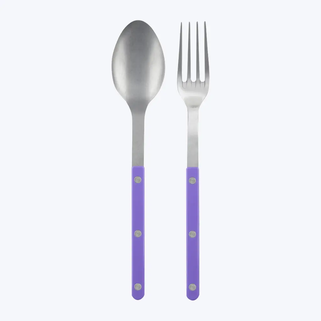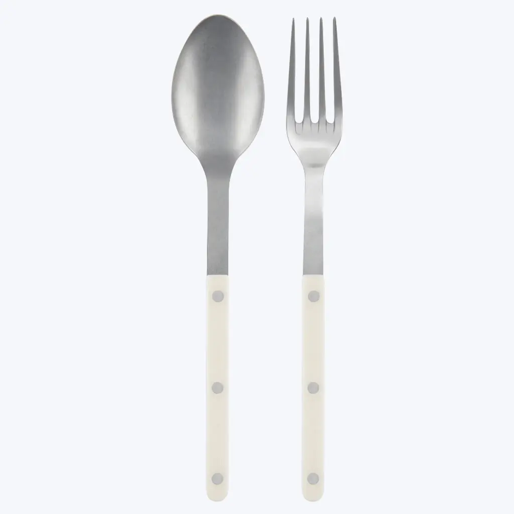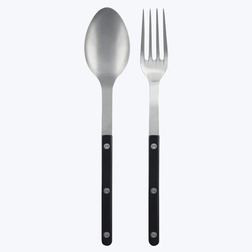 The Bistrot Vintage Finish 2-Piece Serving Set is true to its namesake with design inspiration coming from the Sabre team's favorite restaurants, cafes, and terraces in France. When designing this serving set, Sabre wanted to faithfully capture the bistro atmosphere while adding a modern touch: the styling is simple, the rivets are visible, and each color and material stand out nicely. These 18/10 stainless steel serving utensils feature a vintage finish for a more authentic and rustic appeal. This 2-piece Sabre serving set is comprised of a large fork for serving meat and a large spoon for accompaniments, a vital day-to-day kitchen accessory.Sabre Paris serves as more than just cutlery, it is a representation of decorative objects for the everyday table. For over 30 years, Sabre has provided tables around the world with softened yet understated and functional shapes, designed to fit perfectly in the hand. This collection of flatware is where chic French style and whimsy co-exist. Further Care Details:The Bistrot Flatware Collection is dishwasher safe at 45°C/113°C maximum. Remember to open the dishwasher at the end of the cycle. When washing by hand, Sabre recommends that you do not use abrasive sponges. For cutlery with light-colored handles, avoid prolonged contact with foods that stain such as coffee, tea, tomato sauce, etc. If small rings appear on the knife blades, they can be easily removed with a soft cloth and/or white vinegar.