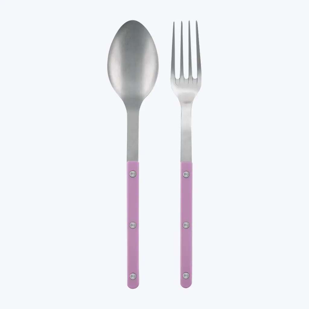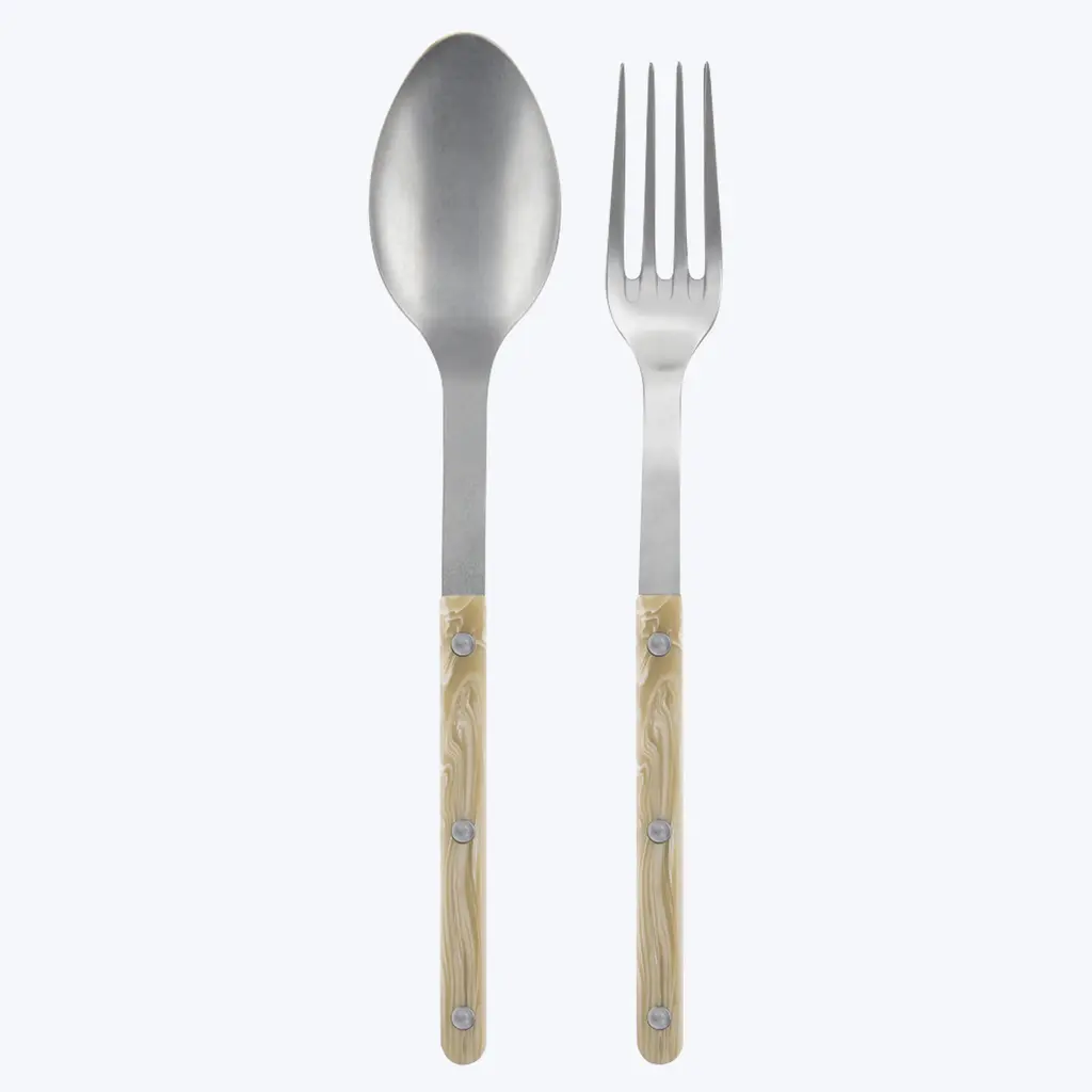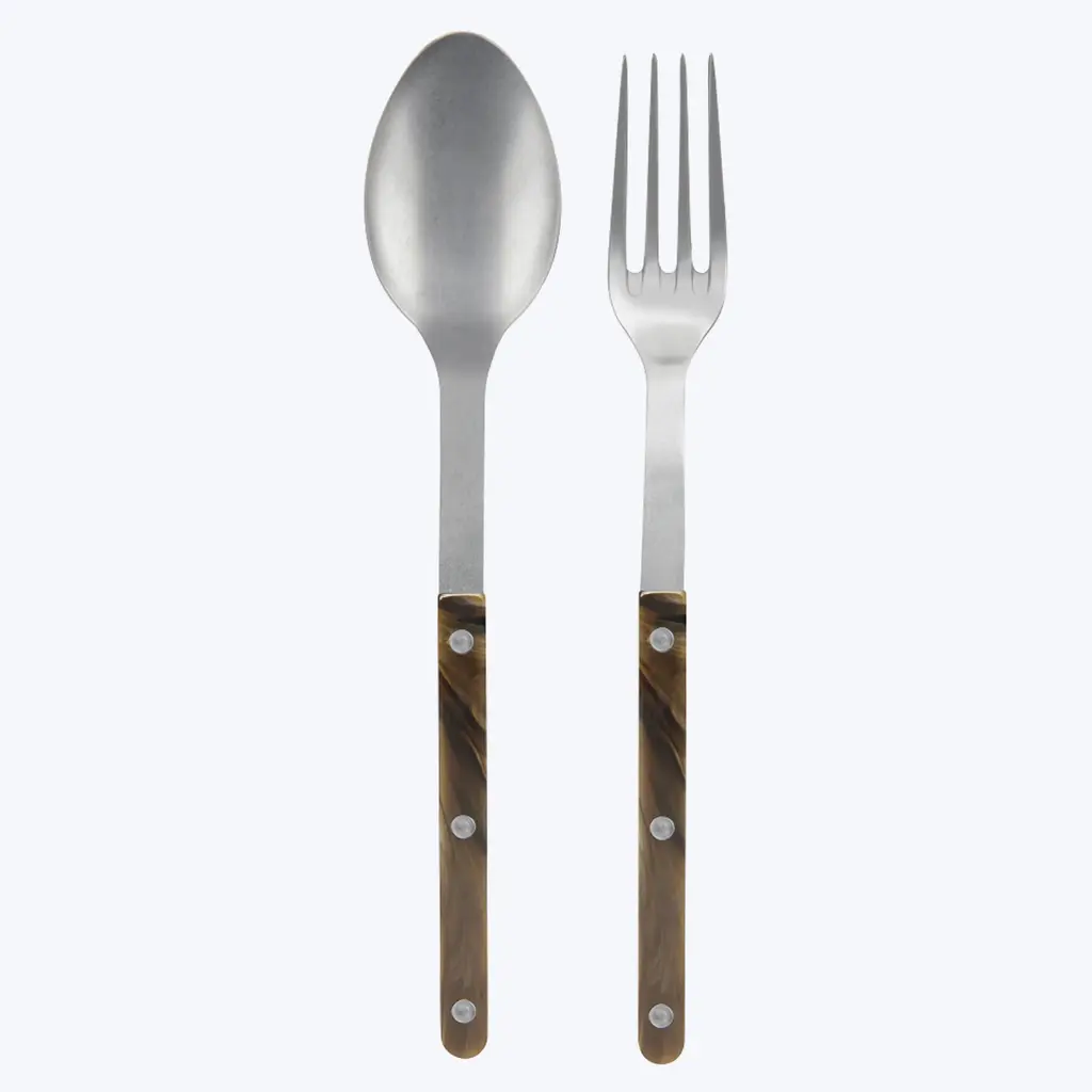 The Bistrot Vintage Finish 2-Piece Serving Set is true to its namesake with design inspiration coming from the Sabre team's favorite restaurants, cafes, and terraces in France. When designing this serving set, Sabre wanted to faithfully capture the bistro atmosphere while adding a modern touch: the styling is simple, the rivets are visible, and each color and material stand out nicely. These 18/10 stainless steel serving utensils feature a vintage finish for a more authentic and rustic appeal. This 2-piece Sabre serving set is comprised of a large fork for serving meat and a large spoon for accompaniments, a vital day-to-day kitchen accessory.Sabre Paris serves as more than just cutlery, it is a representation of decorative objects for the everyday table. For over 30 years, Sabre has provided tables around the world with softened yet understated and functional shapes, designed to fit perfectly in the hand. This collection of flatware is where chic French style and whimsy co-exist. Further Care Details:The Bistrot Flatware Collection is dishwasher safe at 45°C/113°C maximum. Remember to open the dishwasher at the end of the cycle. When washing by hand, Sabre recommends that you do not use abrasive sponges. For cutlery with light-colored handles, avoid prolonged contact with foods that stain such as coffee, tea, tomato sauce, etc. If small rings appear on the knife blades, they can be easily removed with a soft cloth and/or white vinegar.