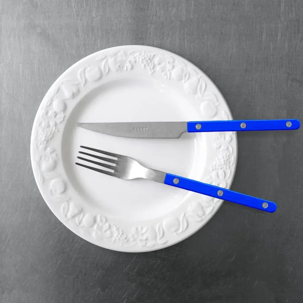 With the Bistrot collection, we were inspired by some of our favorite places: restaurants, terraces and cafés. When designing this cutlery we wanted to faithfully capture the atmosphere while adding a modern touch: the styling is simple, the rivets are visible, while the colors and materials stand out nicely. Available with gloss or vintage finishes, we’re sure you’ll enjoy this collection, which is designed to be both traditional and contemporary at the same time. Established in France in 1993 by Francis Gelb, Sabre Paris is renowned for the vast assortment of printed mix-and-match acrylic designs in its library. All pieces made in France using 18/10 stainless steel. Dishwasher safe.