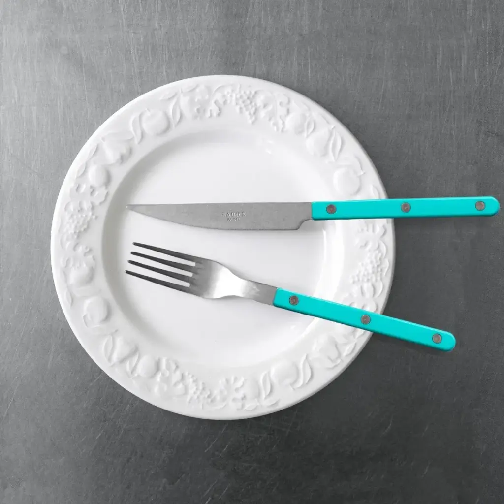 With the Bistrot collection, we were inspired by some of our favorite places: restaurants, terraces and cafés. When designing this cutlery we wanted to faithfully capture the atmosphere while adding a modern touch: the styling is simple, the rivets are visible, while the colors and materials stand out nicely. Available with gloss or vintage finishes, we’re sure you’ll enjoy this collection, which is designed to be both traditional and contemporary at the same time. Established in France in 1993 by Francis Gelb, Sabre Paris is renowned for the vast assortment of printed mix-and-match acrylic designs in its library. All pieces made in France using 18/10 stainless steel. Dishwasher safe.