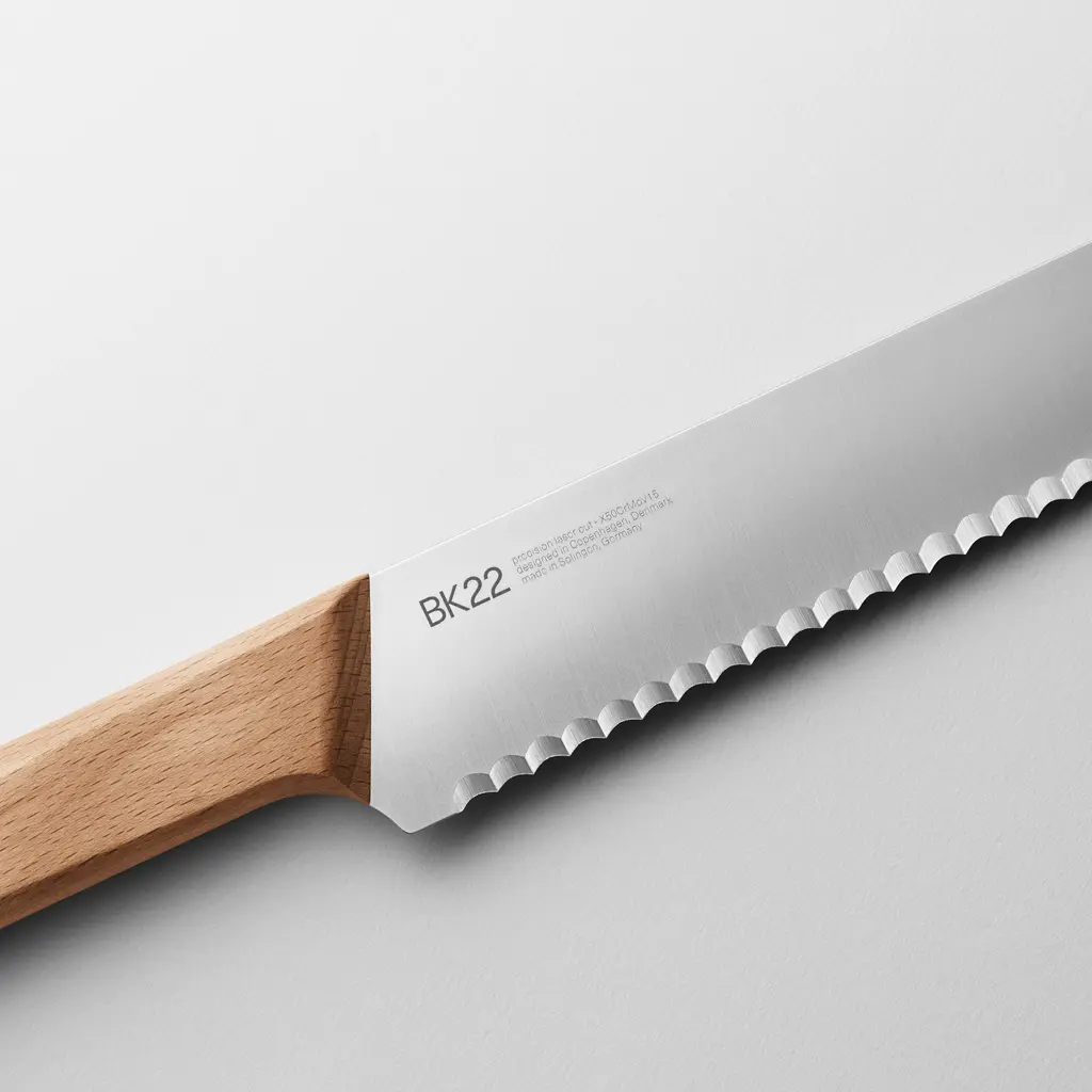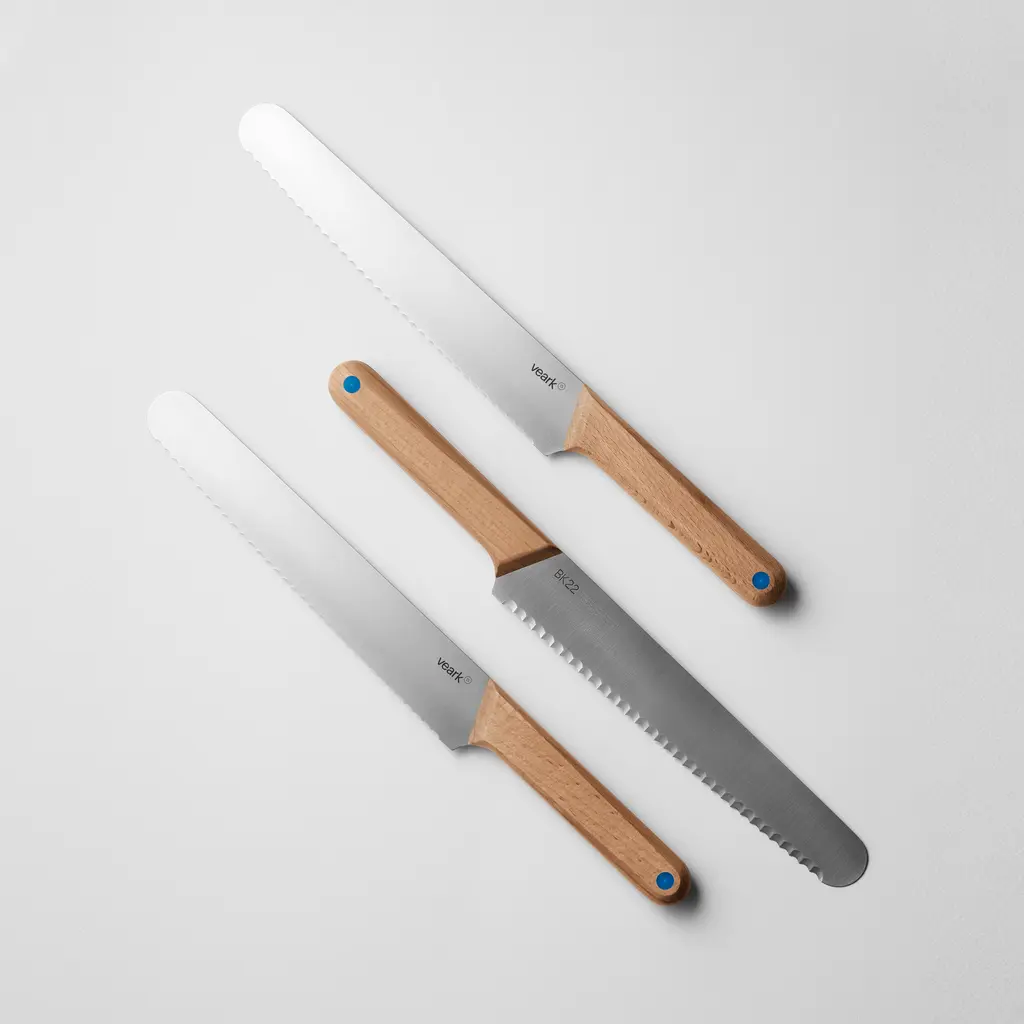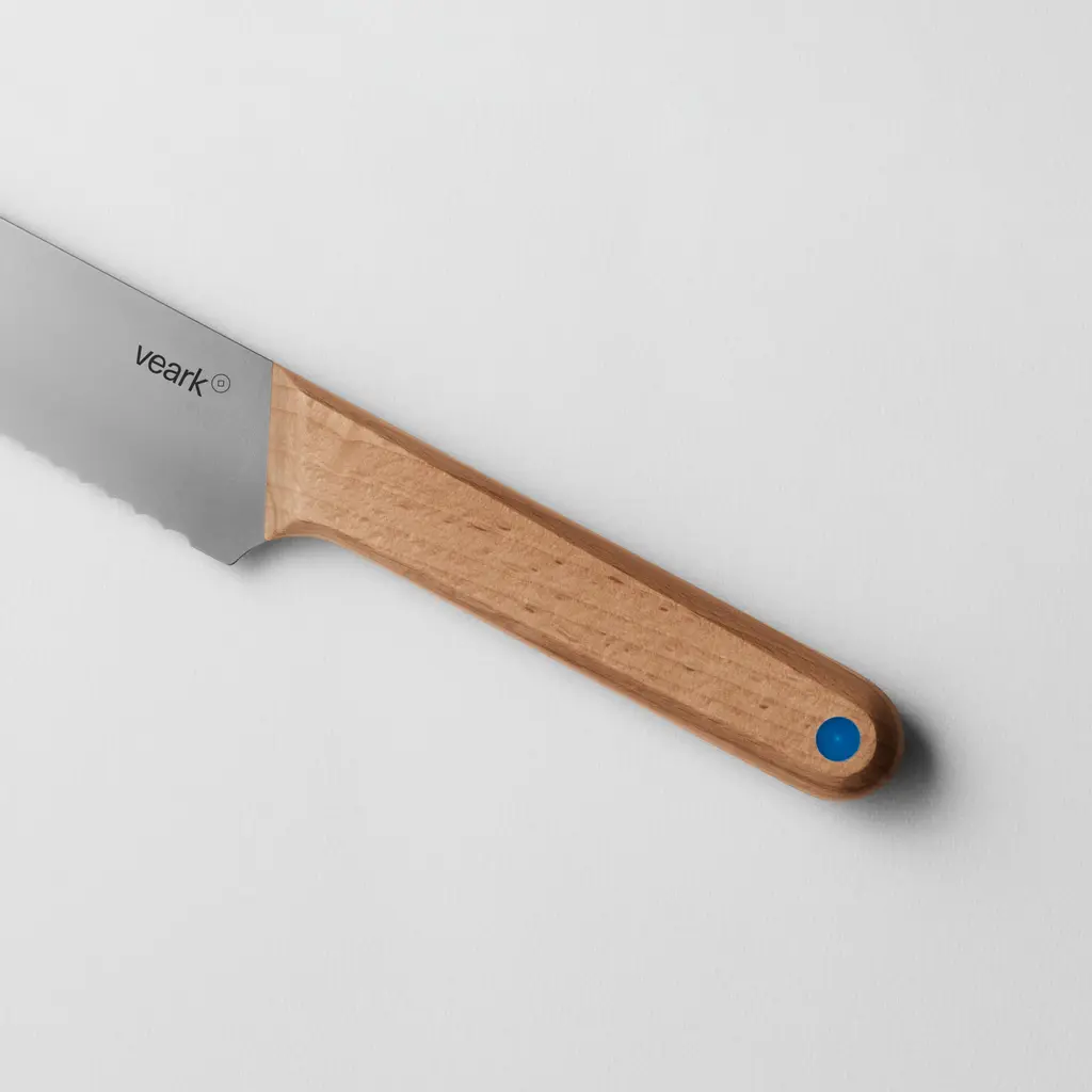 Enjoy cutting through freshly baked bread like butter with the Veark BK22 Bread Knife. Like other knives from the Danish brand, this product is expertly crafted to cut to perfection. The blade is laser cut from stainless steel and features 6 mm teeth and a sandblasted matte finish. Thanks to the subtle curve of the blade, this knife cuts bread all the way through with ease. Veark paired the high-quality blade with a natural beech wood handle. The natural material will develop a patina over time, transforming the knife into a one of a kind object. A signature blue rivet holds the knife and handle together. To create the BK22 knife, Veark partnered with Copenhagen-based chef and bread maker Jesper Gøtz.