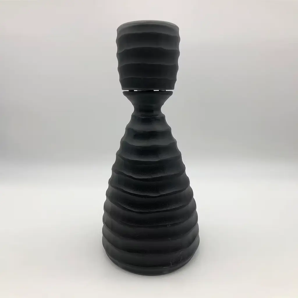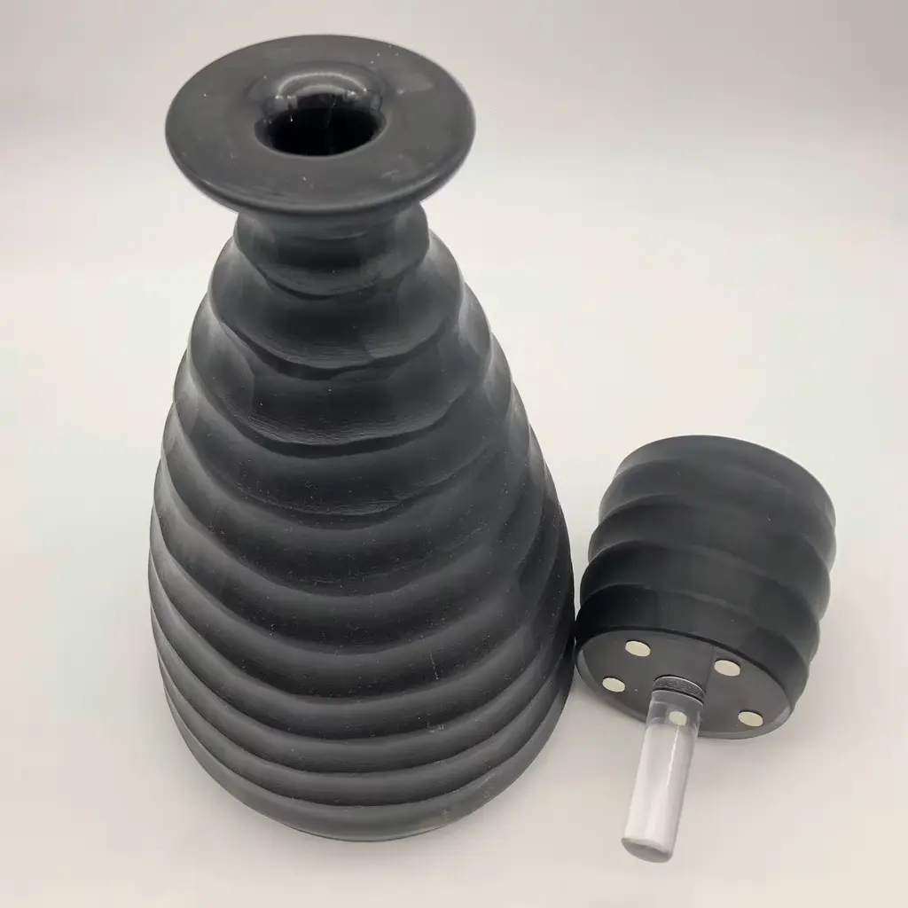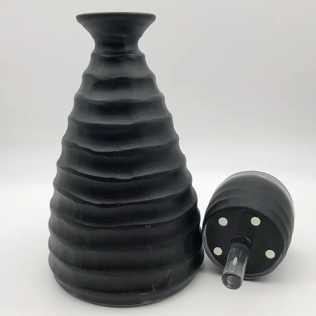 A singular way of serving cool water during a Sunday lunch, this black bottle with lid combines traditional craftsmanship and contemporary aesthetic in a captivating cone-shaped silhouette. Entirely handmade of glass by master glassblower Achille D'Este and carved by hand by glassmaker Renzo Vianello, it flaunts an irregularly-ribbed shape that lends it a unique charm.