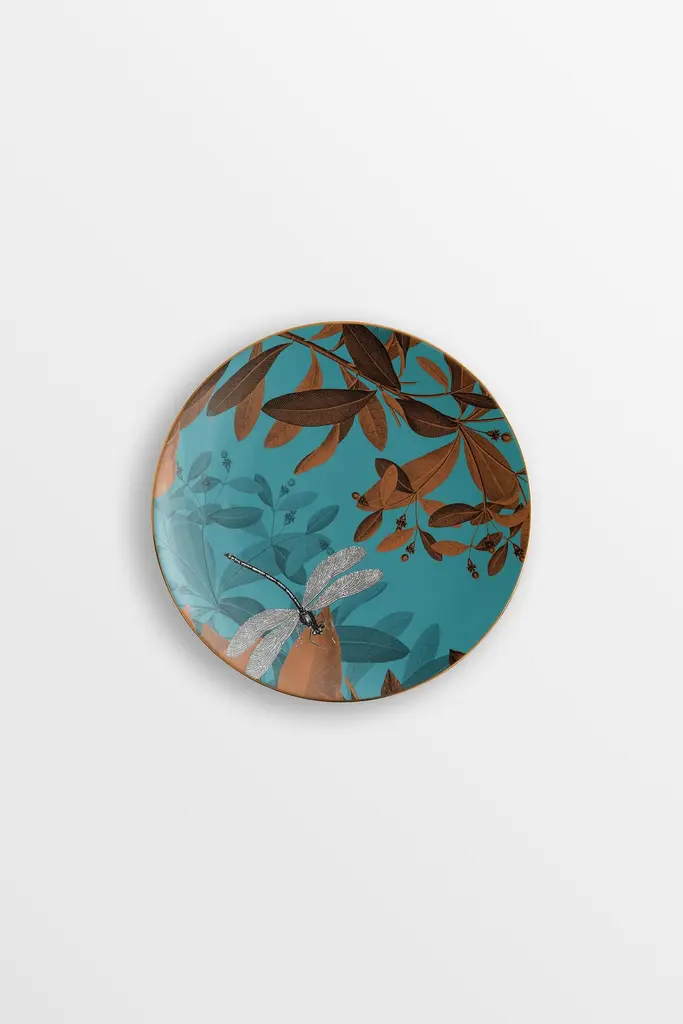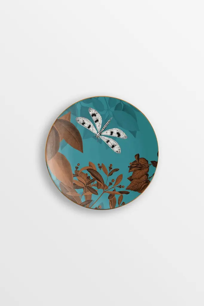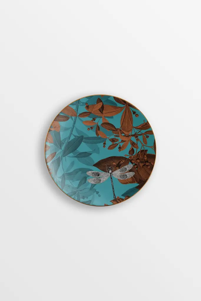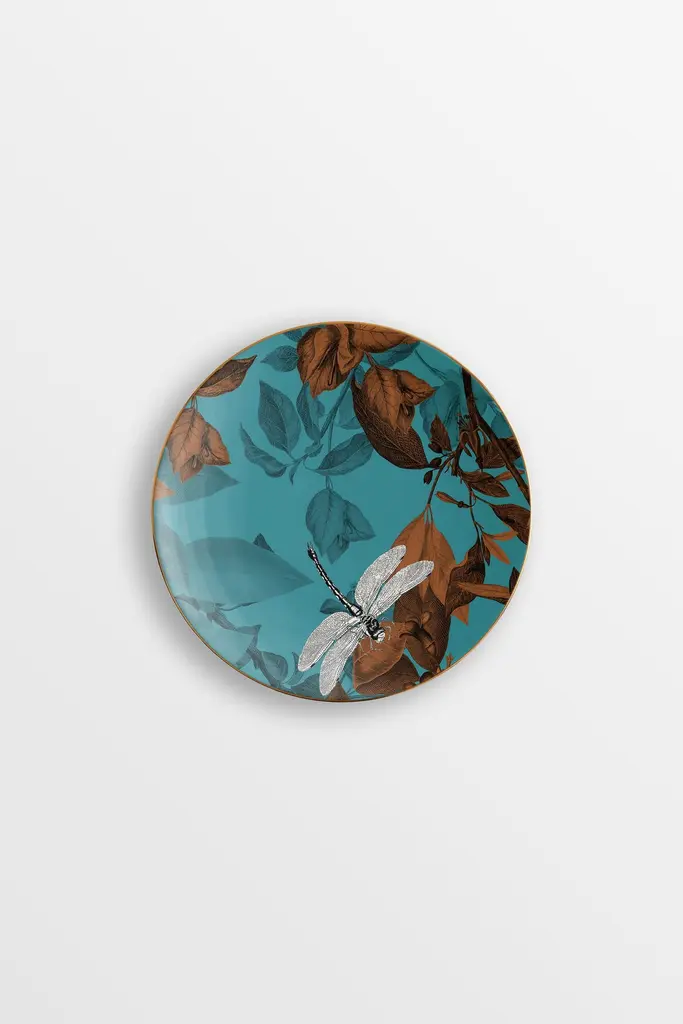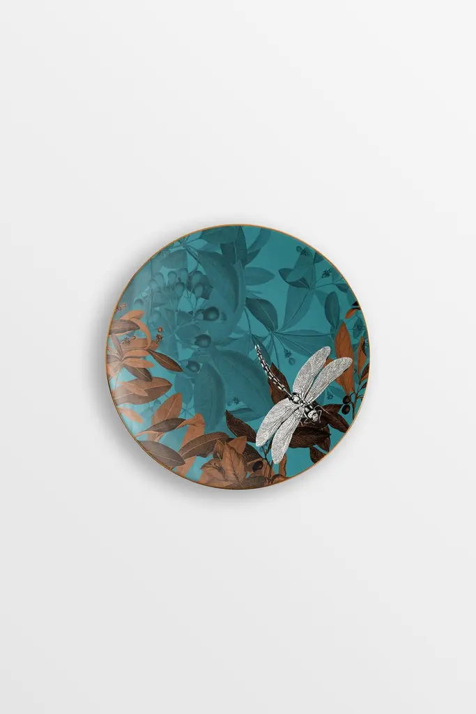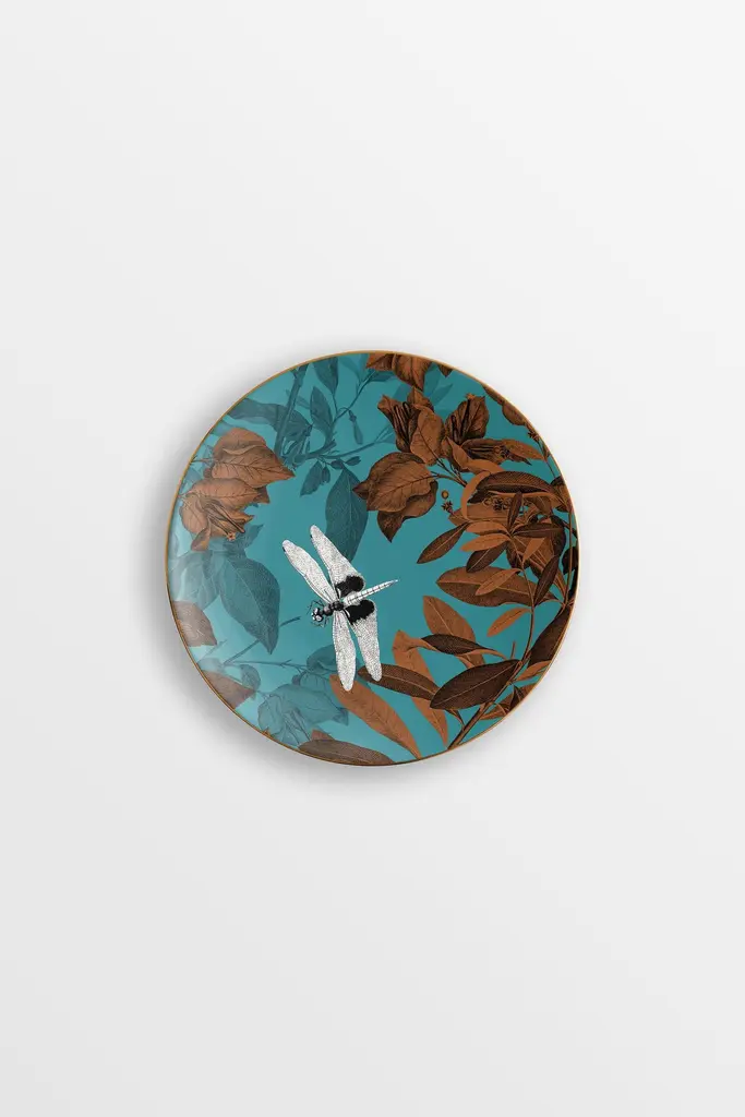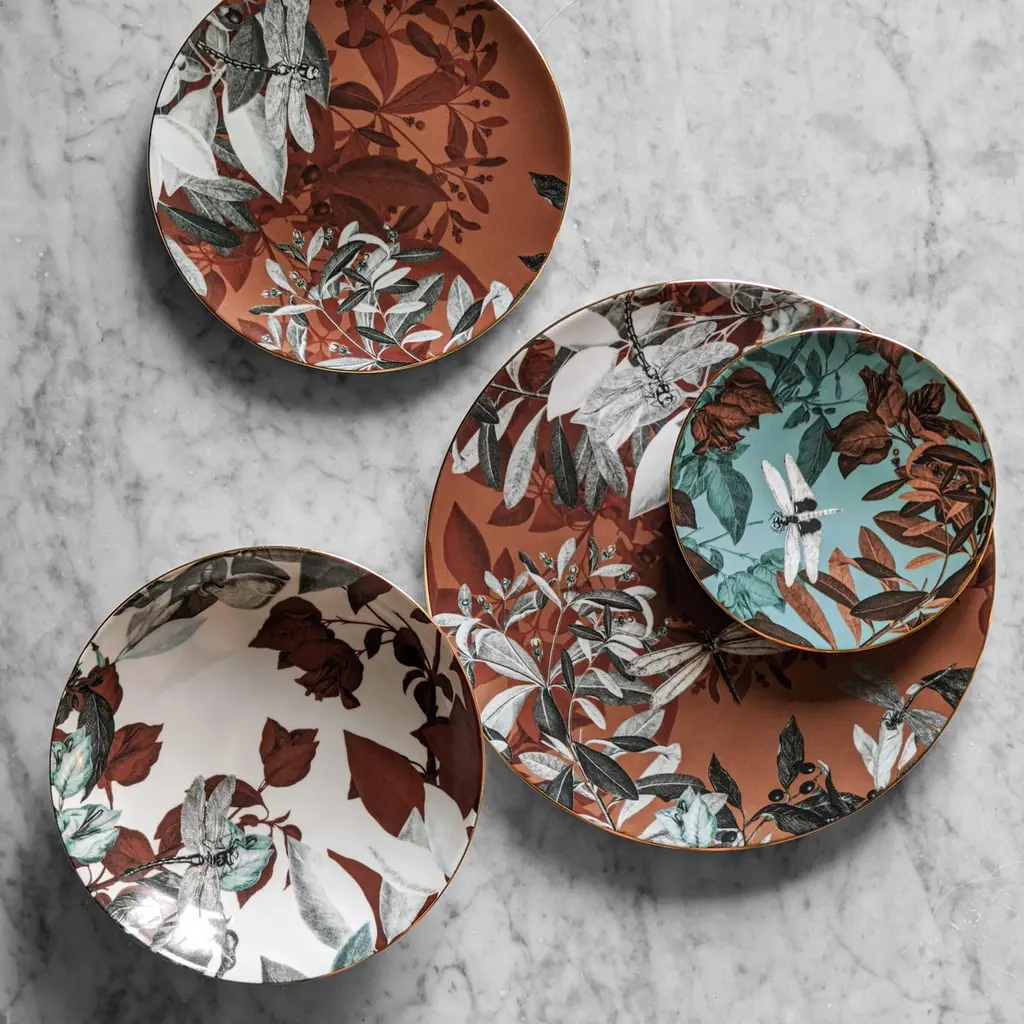 Black dragon pool is a collection of plates and vases inspired by the famous Chinese pond of the same name, located in the scenic Jade Spring Park. The designs in this collection feature dragonflies drawn in black and white flying and resting on a rich composition of reddish leaves, all enriched with turquoise details.6 bread plates.