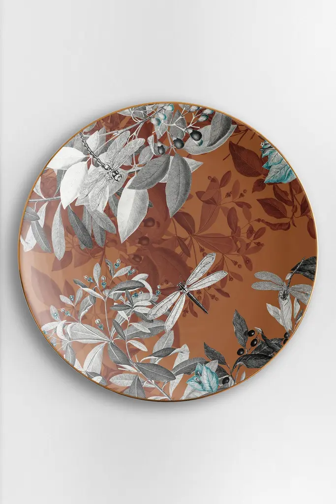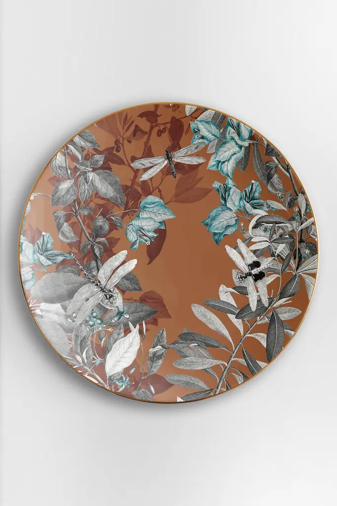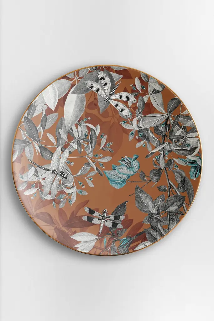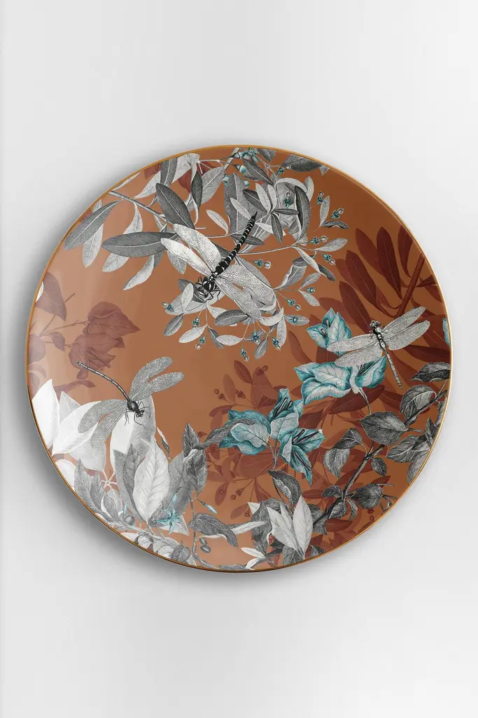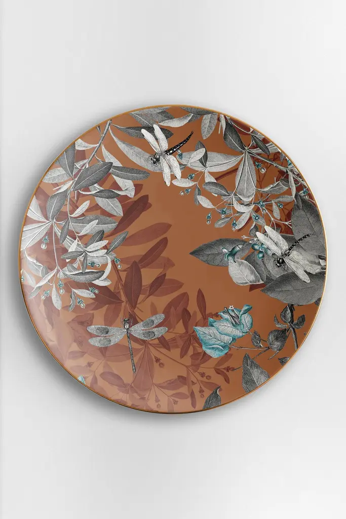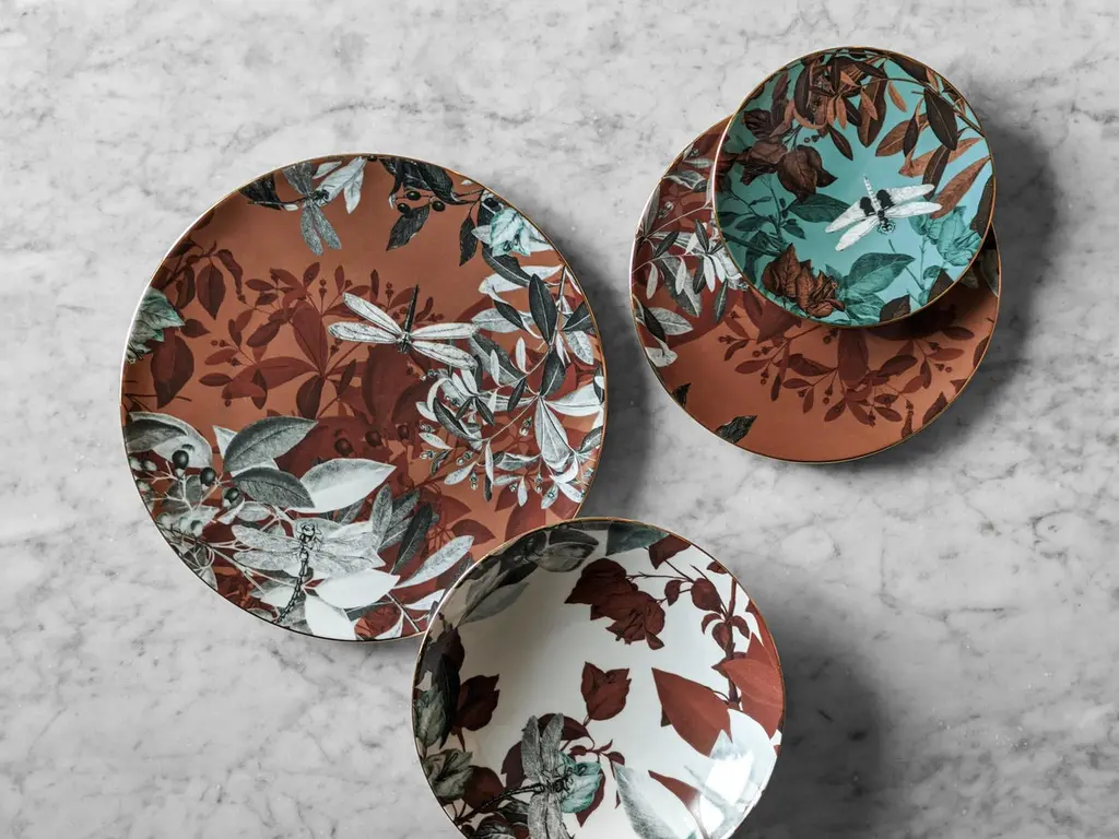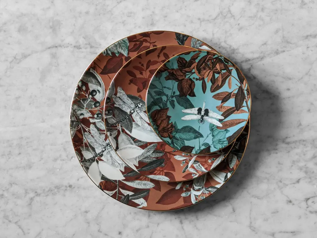 Black dragon POOL is a collection of plates and vases inspired by the famous Chinese pond of the same name, located in the scenic Jade Spring Park. The designs in this collection feature dragonflies drawn in black and white flying and resting on a rich composition of reddish leaves, all enriched with turquoise details.Set of six 28cm diameter plates.
