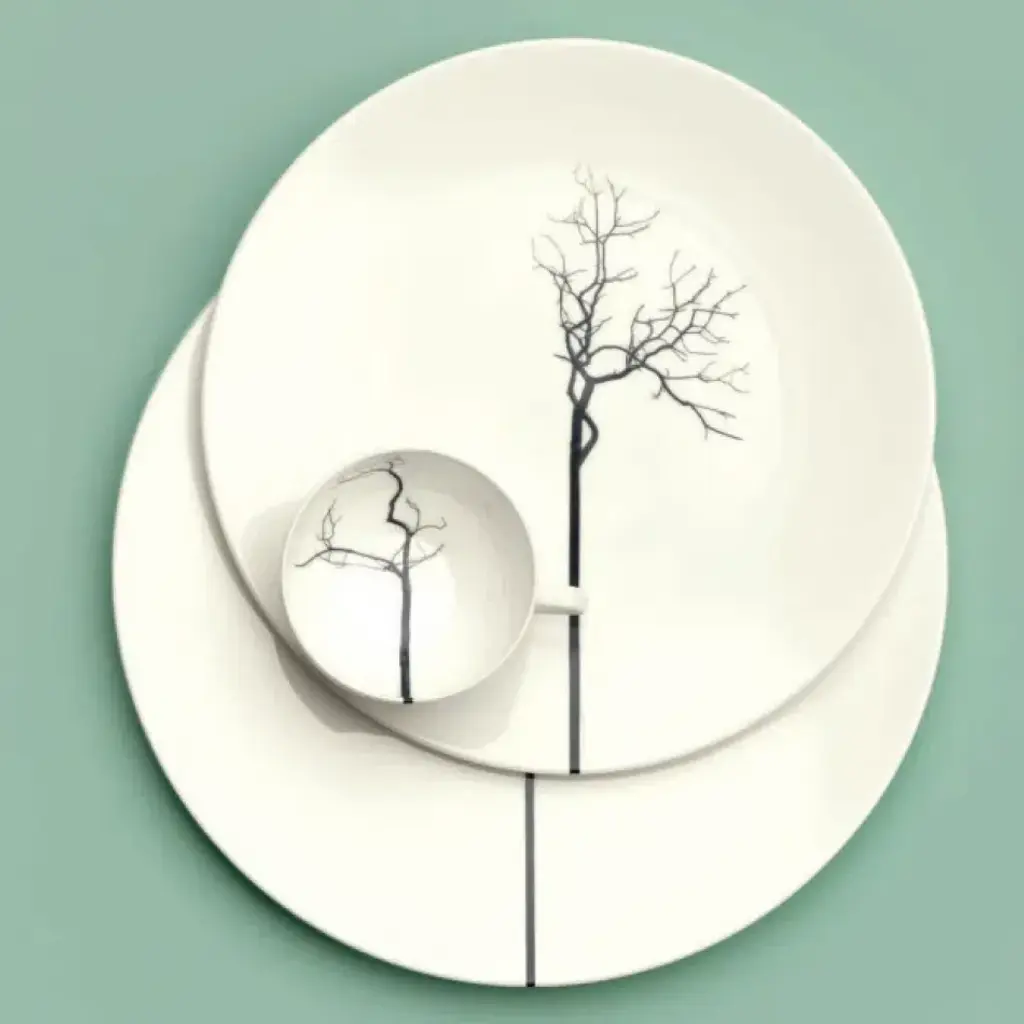 Inspired by nature, modern and individually staged. Various black silhouettes of trees branch out tenderly over cups and plates, seem to be natural and abstract at the same time. The trunk continues over the rims of the cups and develops to a graphic element.