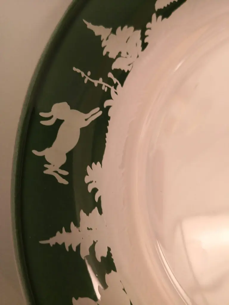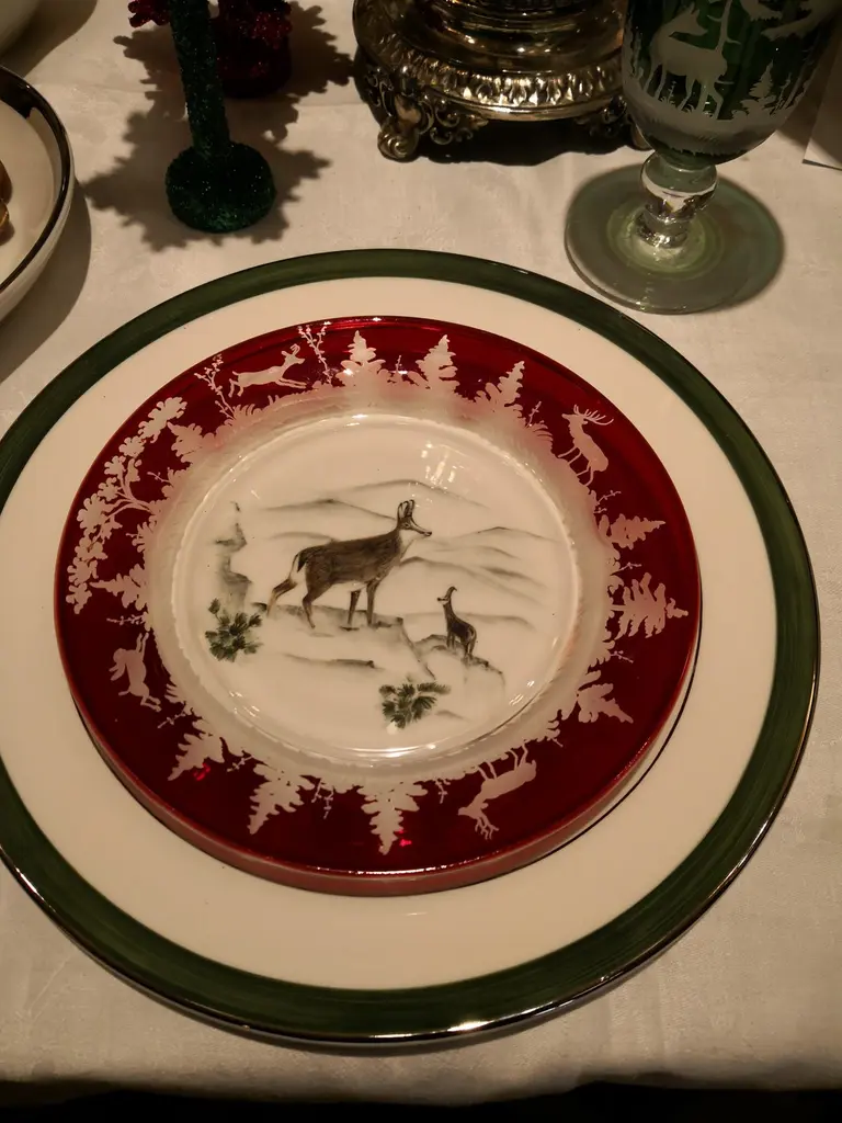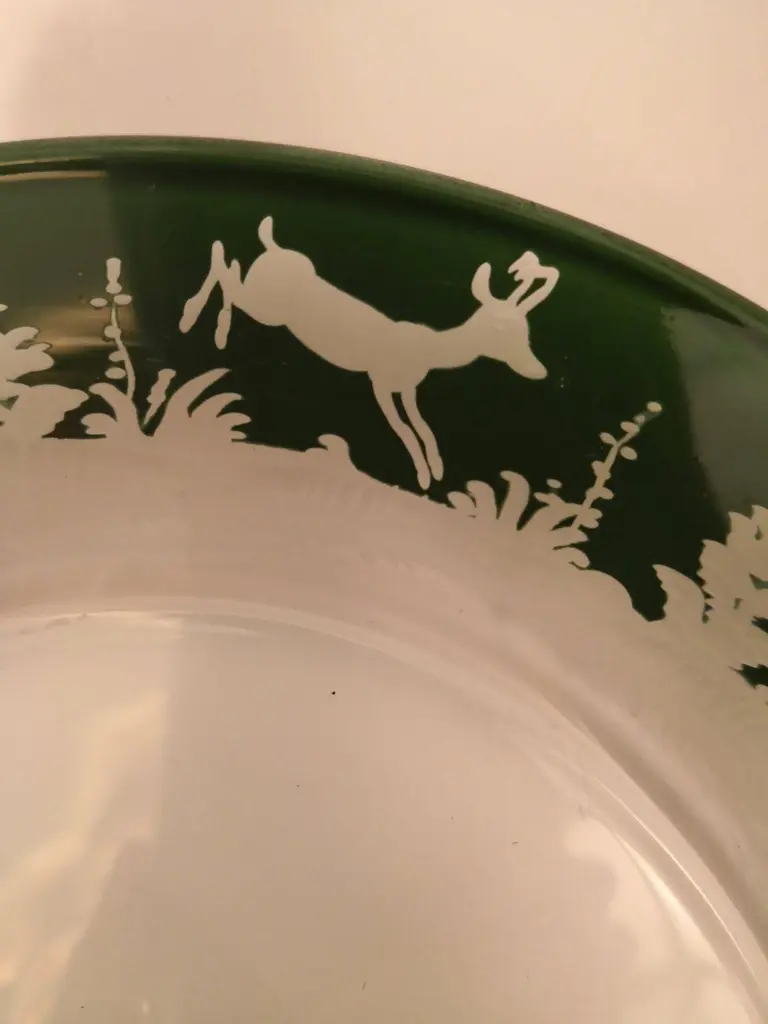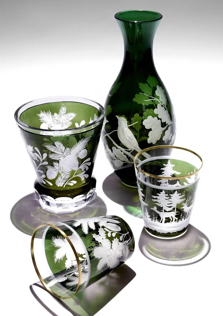 Set of six plates in green crystal with an antique hunting decor all around. The charming hand-engraved decor shows an antique decor with deers, a rabbit and trees in the style of black forest. The glass plates can be ordered in different colors. All glass plates are entirely handmade in Bavaria Germany. The size of this plate is perfect to serve salad, dessert or starters. Looks great on top of every other plate. Comes also in red glass. Colored crystal is not recommended for dishwasher use.About Sofina crystal:Sofina crystal was established in 2013 in Bavaria/Germany and stands for traditional craftsmanship in the tradition of the 18th century. All items are handblown and free-hands engraved by glass artists who are experienced in the traditional glass craft for many generations.