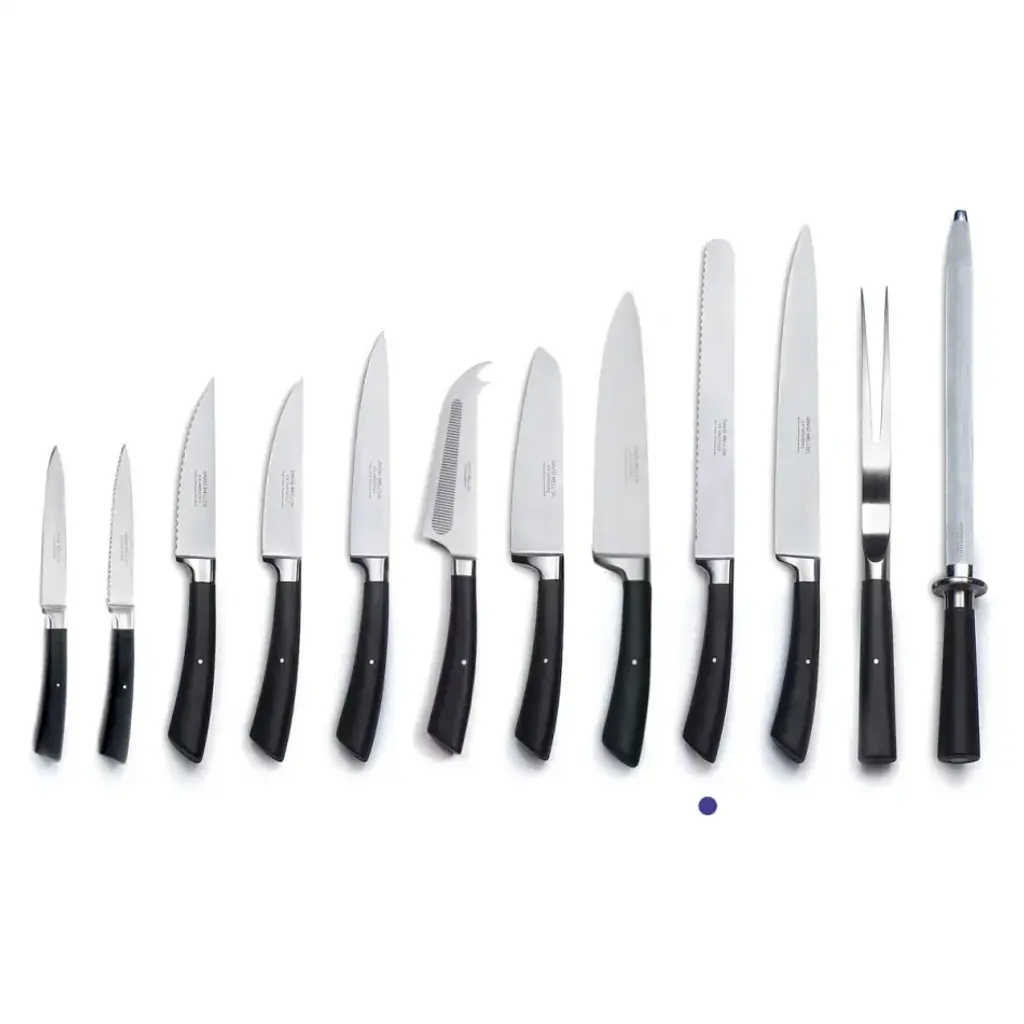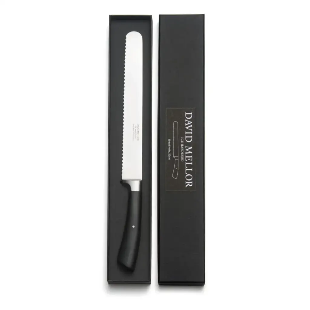 Corin Mellor's 'Black Handle' stainless steel kitchen knives, specially developed for David Mellor Design, have proved enormously popular since they were first introduced. The collection has a very distinctive modern look and high levels of performance, using the latest innovative manufacturing techniques. Ice hardening processes make the blades exceptionally sharp. These are really professional kitchen knives, superb in quality and beautiful to use. These are razor sharp knives. The high carbon stainless steel blades exploit the latest techniques of steel casting and are then ice hardened to minus 80°c. This innovative process stabilizes the metallurgical structure of the steel, creating an extremely hard and durable cutting edge. The knives are taper ground with the forging running down the full length of the handle. Each knife handle incorporates an internal back weight, giving an excellent balance and grip. All knives are supplied in individual David Mellor boxes.