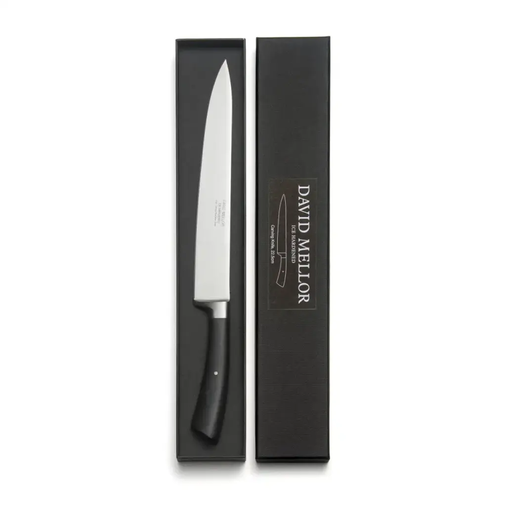 Corin Mellor's 'Black Handle' stainless steel kitchen knives, specially developed for David Mellor Design, have proved enormously popular since they were first introduced. The collection has a very distinctive modern look and high levels of performance, using the latest innovative manufacturing techniques. Ice hardening processes make the blades exceptionally sharp. These are really professional kitchen knives, superb in quality and beautiful to use. These are razor sharp knives. The high carbon stainless steel blades exploit the latest techniques of steel casting and are then ice hardened to minus 80°c. This innovative process stabilizes the metallurgical structure of the steel, creating an extremely hard and durable cutting edge. The knives are taper ground with the forging running down the full length of the handle. Each knife handle incorporates an internal back weight, giving an excellent balance and grip. All knives are supplied in individual David Mellor boxes.