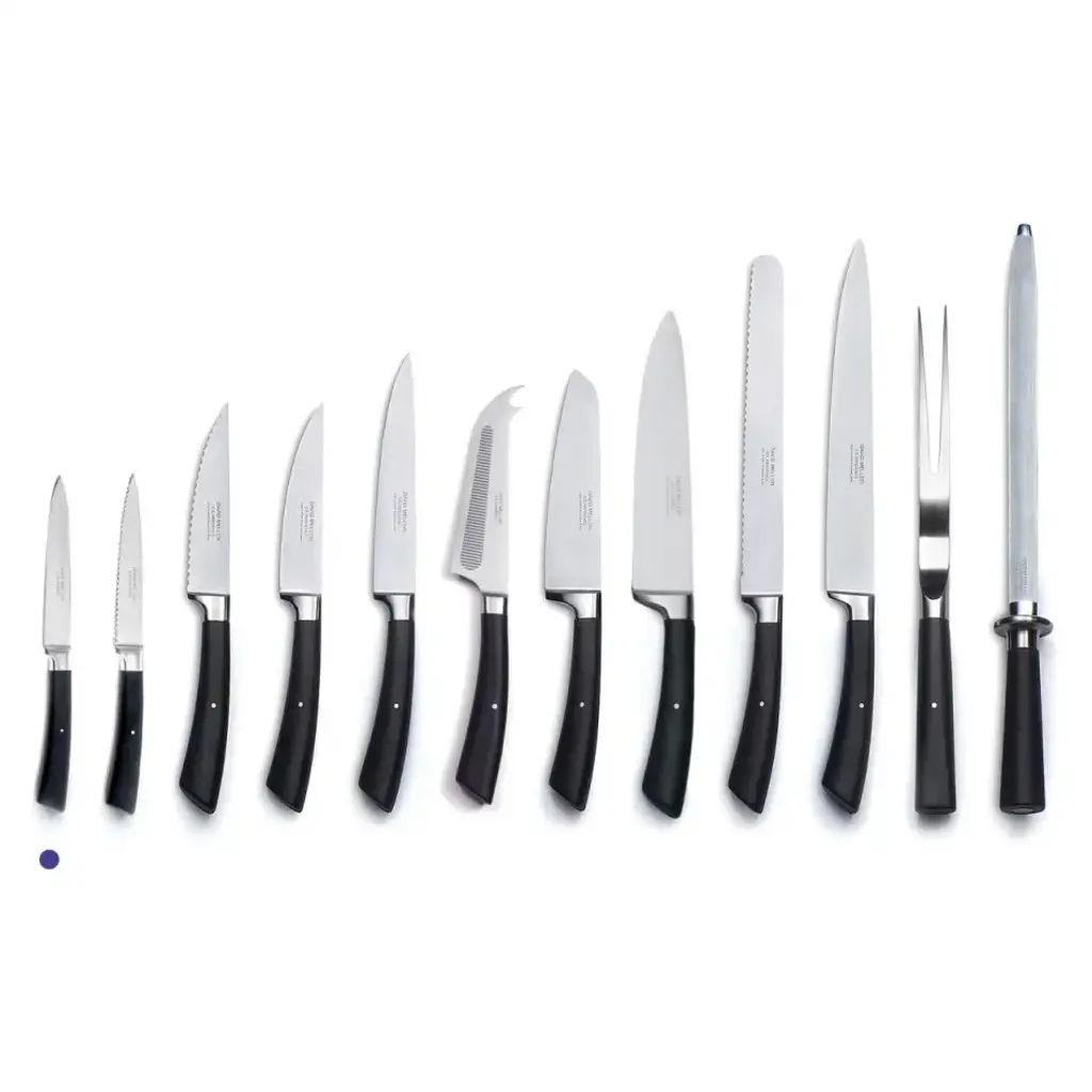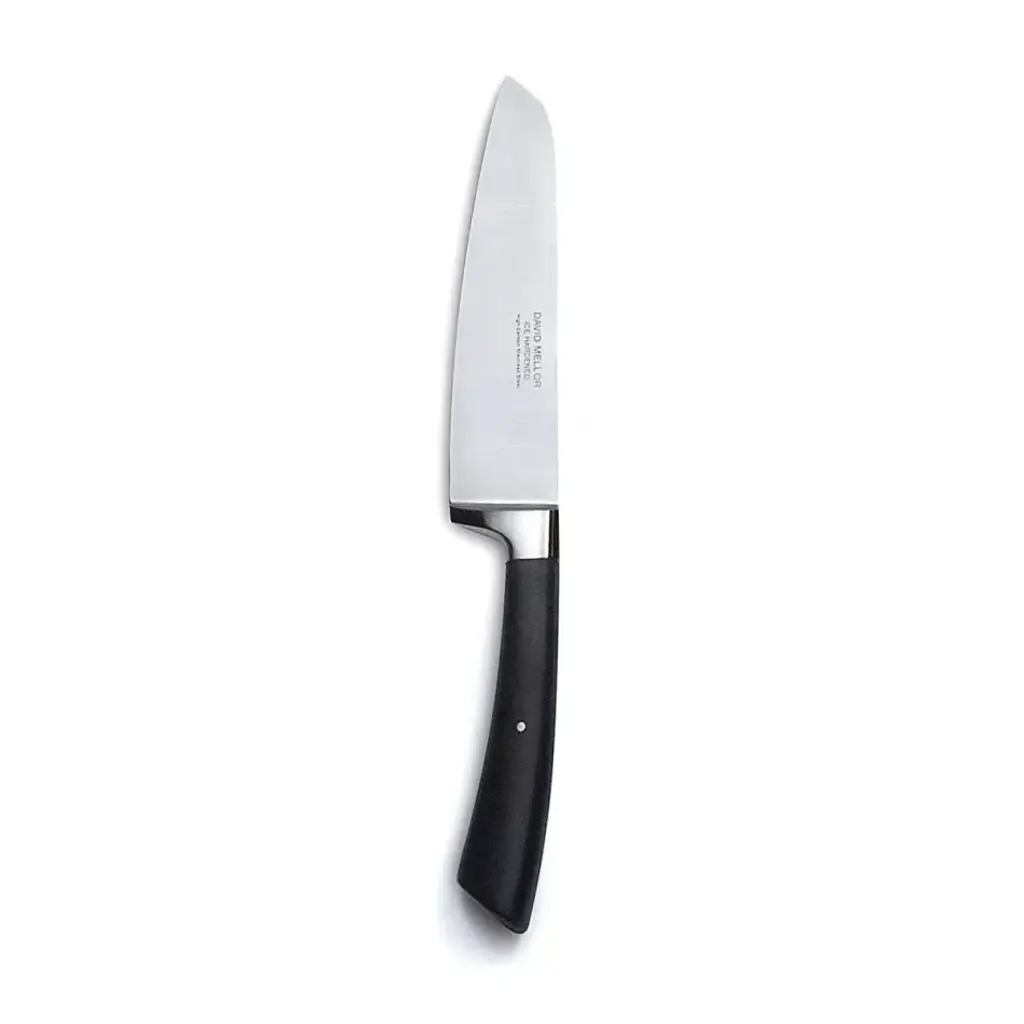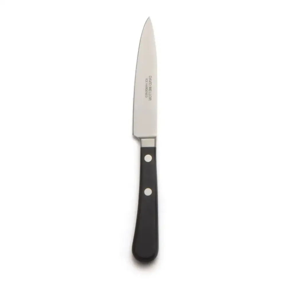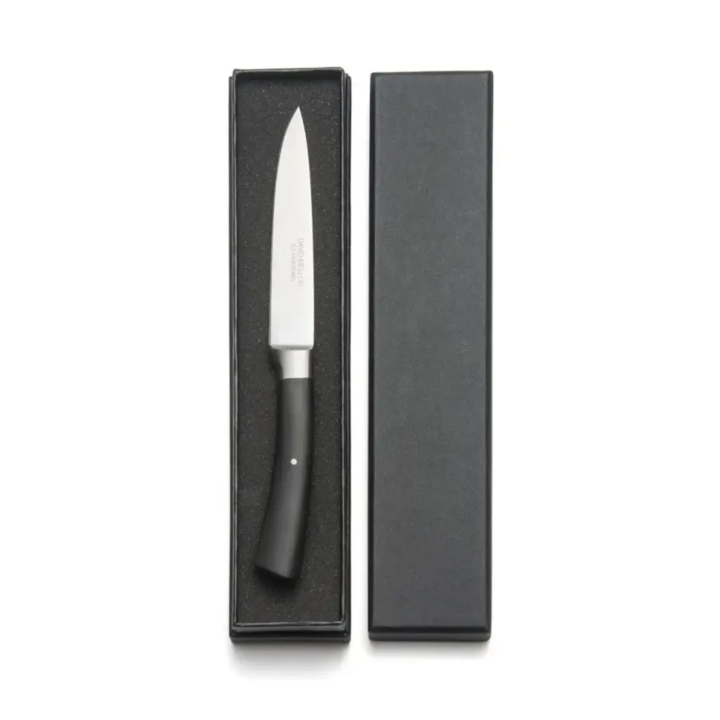 Corin Mellor's 'Black Handle' stainless steel kitchen knives, specially developed for David Mellor Design, have proved enormously popular since they were first introduced. The collection has a very distinctive modern look and high levels of performance, using the latest innovative manufacturing techniques. Ice hardening processes make the blades exceptionally sharp. These are really professional kitchen knives, superb in quality and beautiful to use. These are razor sharp knives. The high carbon stainless steel blades exploit the latest techniques of steel casting and are then ice hardened to minus 80°c. This innovative process stabilizes the metallurgical structure of the steel, creating an extremely hard and durable cutting edge. The knives are taper ground with the forging running down the full length of the handle. Each knife handle incorporates an internal back weight, giving an excellent balance and grip. All knives are supplied in individual David Mellor boxes.