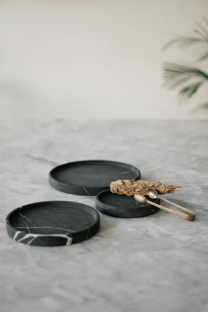 Plates in Monterrey black marble. Handmade in Mexico by local craftsmen. Dimensions: Small: 20 D x 20 W x 2 H cm Medium: 16 D x 16 W x 2 H cm Large: 12 D x 12 W x 2 H cm. Production time: 6-8 weeks for items without marble / 13-14 weeks for marble pieces. Shipping +10 additional business days. Casa Quieta uses natural materials such as woods, stones, fabrics etc. These materials may vary in tone, veining, and cavities due to their natural origin. This is part of the inherent beauty of materials and is not considered a flaw. Due to the artisan nature of our production process, there is a +/- 3mm measurement tolerance.