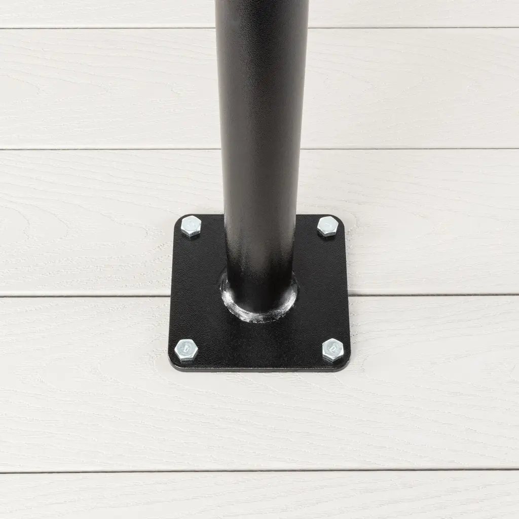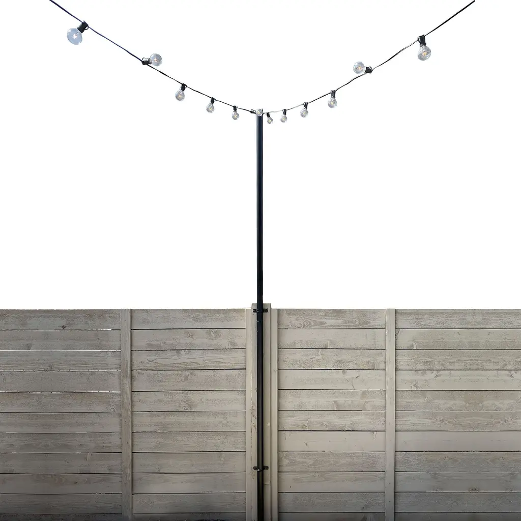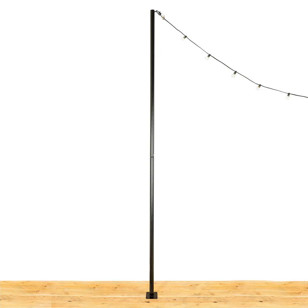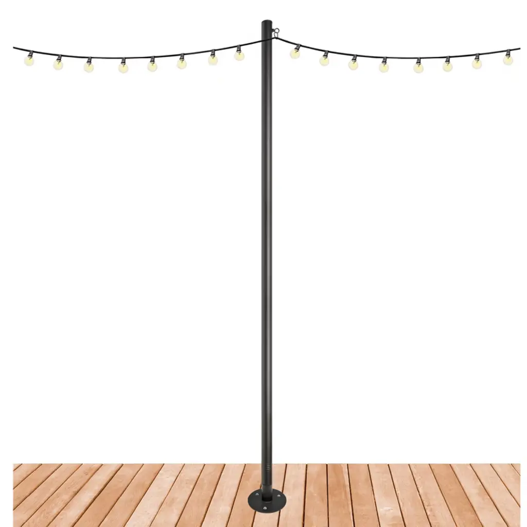 Bring instant mood lighting to a wooden deck or concrete patio with this IYN string-light stand, a black-steel pole with a base plate for permanent mounting. Securing one end of a 30-foot strand of string lights on the deck or patio, this durable outdoor pole looks sleek and professional. Bringing romantic illumination to your backyard entertaining space, you can mount two or more of these stylish IYN stands to amplify the ambience.