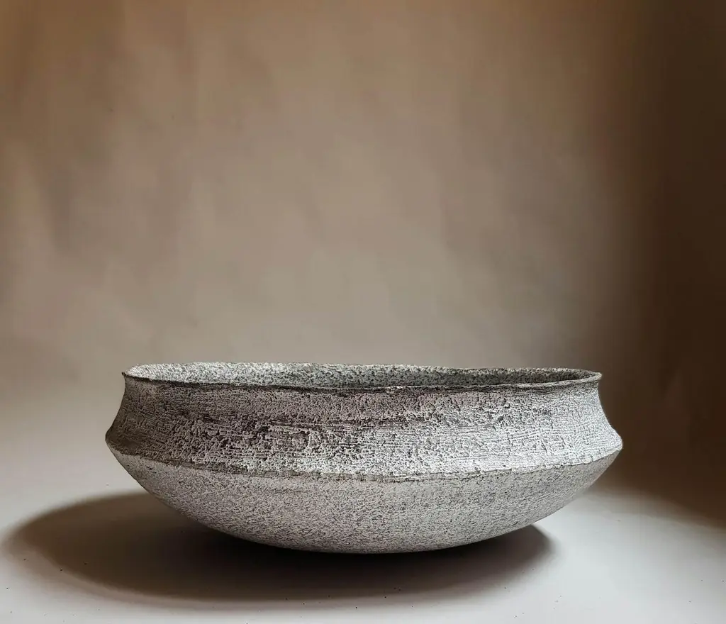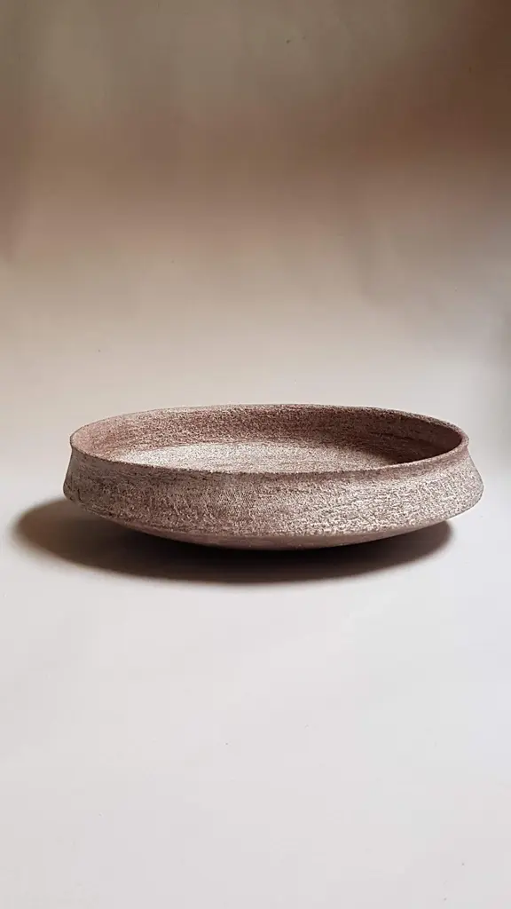Black Stoneware Phiale Plate by Elena VasilantonakiUniqueDimensions: ⌀ 30 x H 10 cm (Dimensions may vary)Materials: StonewareAvailable finishes: With\without handle - Black, White, Brown, Red, White PatinaGrowing up in Greece I was surrounded by pottery forms that have changed little since the ancient times. Inspired by the various forms of those early vessels, I create works with an ancient feel and a minimalistic aesthetic, incorporating the principle of Japanese aesthetics of wabi sabi.The pieces are built entirely by hand with the coiling technique, in a variety of stoneware clays, red, black, white, brown, brushed with terra sigillata and\or experimental glazes and textured surface, resulting in slight variations with each piece.No watertight. Made in Athens, Greece.
