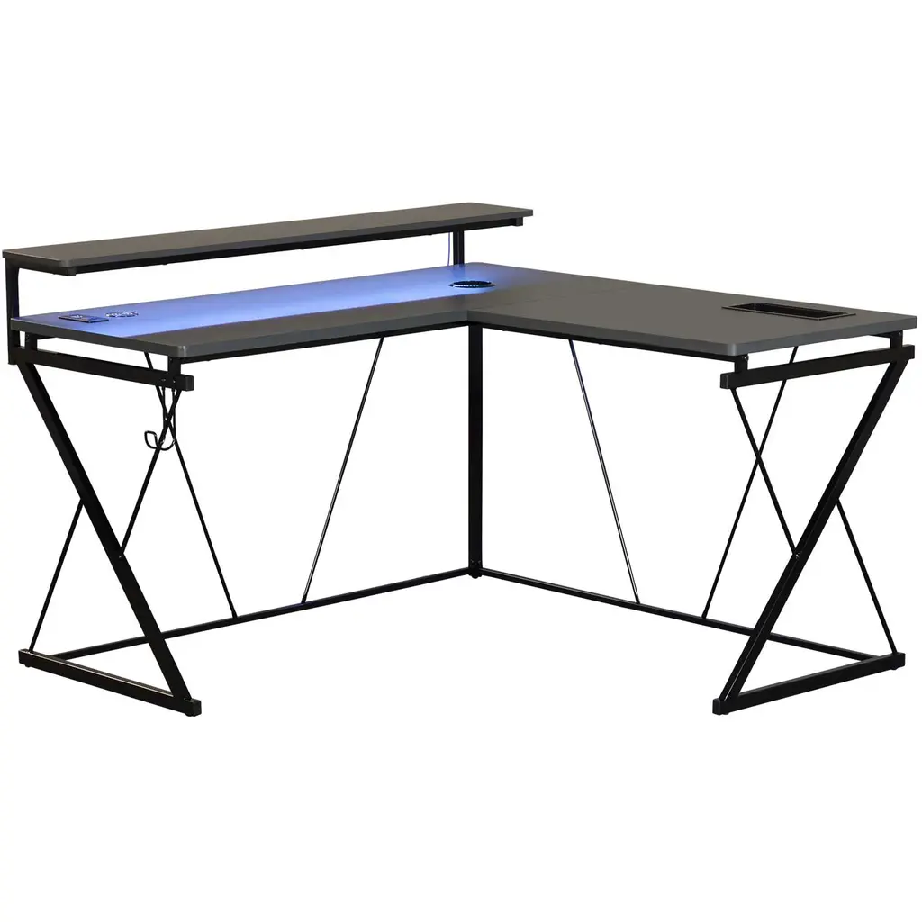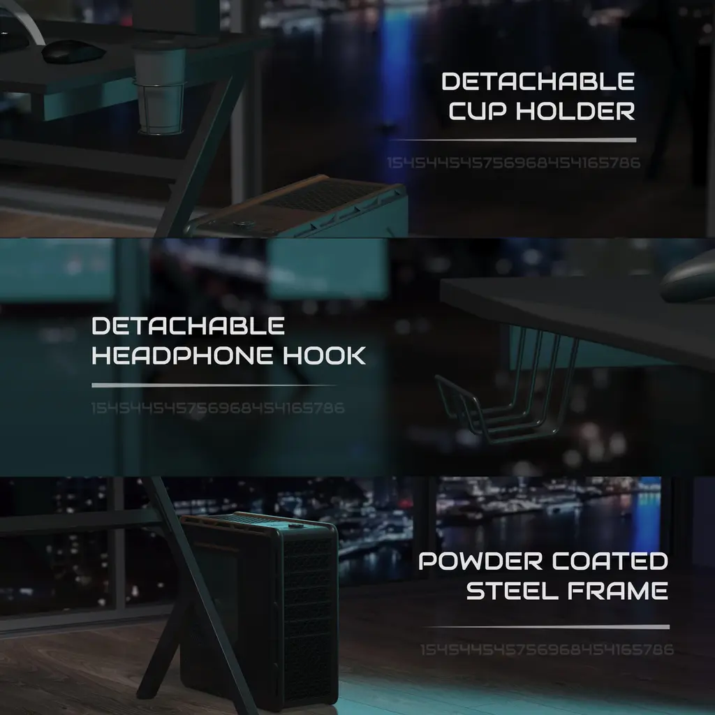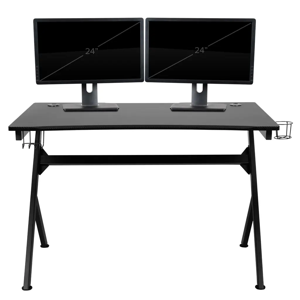 Data Saved. The Legend 88 gaming desk has now arrived. Elite level surface area allows you to house multiple monitors, consoles, and other gaming hardware, while two cable management holes keep wires under control. Decked out a with detachable cupholder and headphone hook. Stealthy powder coated framing holds up to 110 lbs. of static weight capacity and includes self leveling floor glides. A carbon fiber top completes the hardware package.
