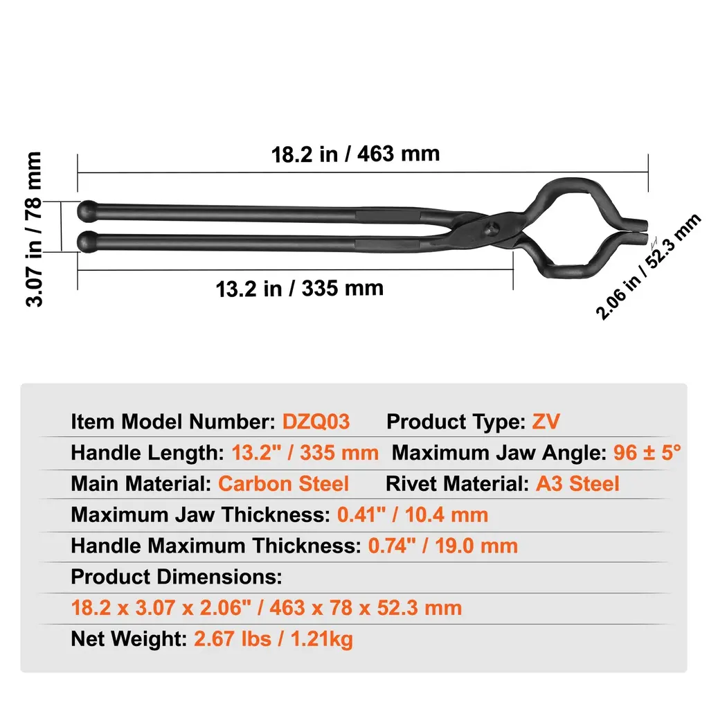 Z V-Bit Tongs: Sink-style jaws of our blacksmith tongs allow long-shaped forgings to pass through from below, ideal for knife blades, long pieces, circular pieces, and other shapes. Wolf Jaw Tongs: The jaws of our blacksmith tongs feature upper and lower biting teeth, making it convenient to grip various shapes of forgings and shape them. They are primarily designed for horseshoes, curved shapes, block forgings, and unique shapes. V-Bit Bolt Tongs: The deep V-shaped jaws of our blacksmith tongs can tightly grip hammered objects, specifically designed for long, irregular, and nail-shaped forgings. 18" Extended Total Length: The uniquely designed long handle of the forge tongs ensures security by keeping users away from heat sources. Feel the difference as you work with confidence and precision without worrying about burns or discomfort. Craftsmanship Meets Comfort: No more fatigue! The 2.67 lbs (1.21kg, for Z V-bit Tongs option) / 2.47 lbs (1.12kg, for Wolf Jaw Tongs option) / 2.49 lbs (1.13 kg, for V-Bit Bolt Tongs option) lightweight forging tongs allow for extended gripping without strain. The small round ball design at the end keeps slips at bay, while the handle's gentle curves make forging a breeze. Premium Carbon Steel: Quality materials are essential for blacksmithing tongs, so we choose premium carbon steel for durability even in high-temperature environments, maintaining stability and longevity. A3 Steel Rivets: The rivet component is made of high-quality A3 steel, ensuring durability and longevity in high-temperature environments. Precise tolerance adjustments in the rivet joint ensure accurate control of the dimensions of the forging. Package Content 1 x Z V-bit Tongs 1 x User Manual