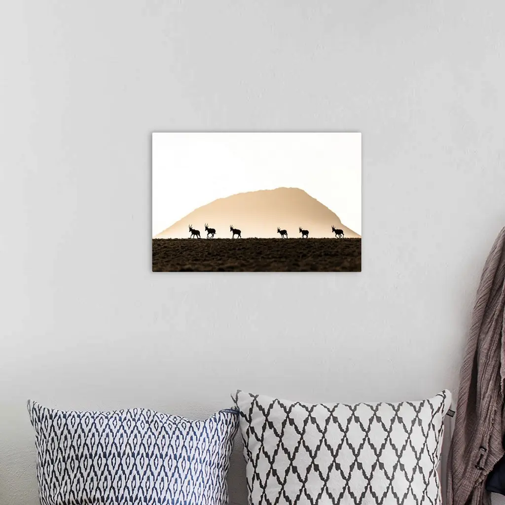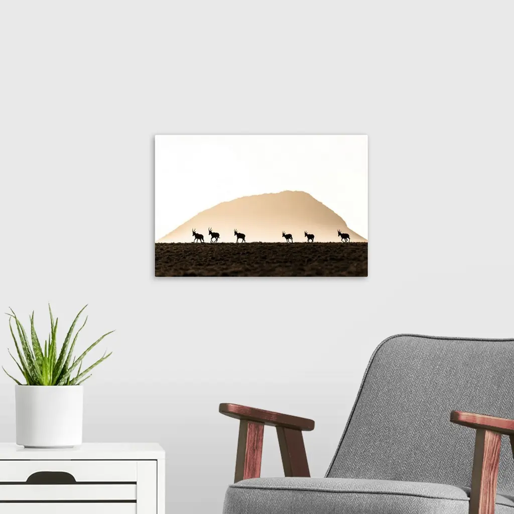 Blesbok (Damaliscus pygargus phillipsi) running across a mountainous plateau, Mount Camdaboo Private Game Reserve, Eastern Cape, South Africa.